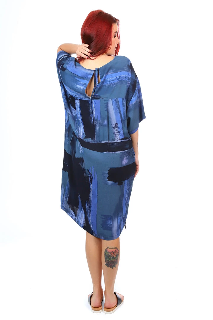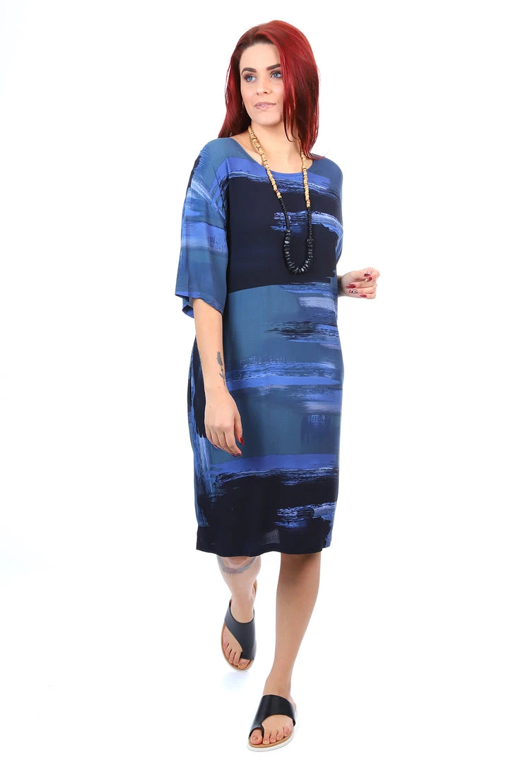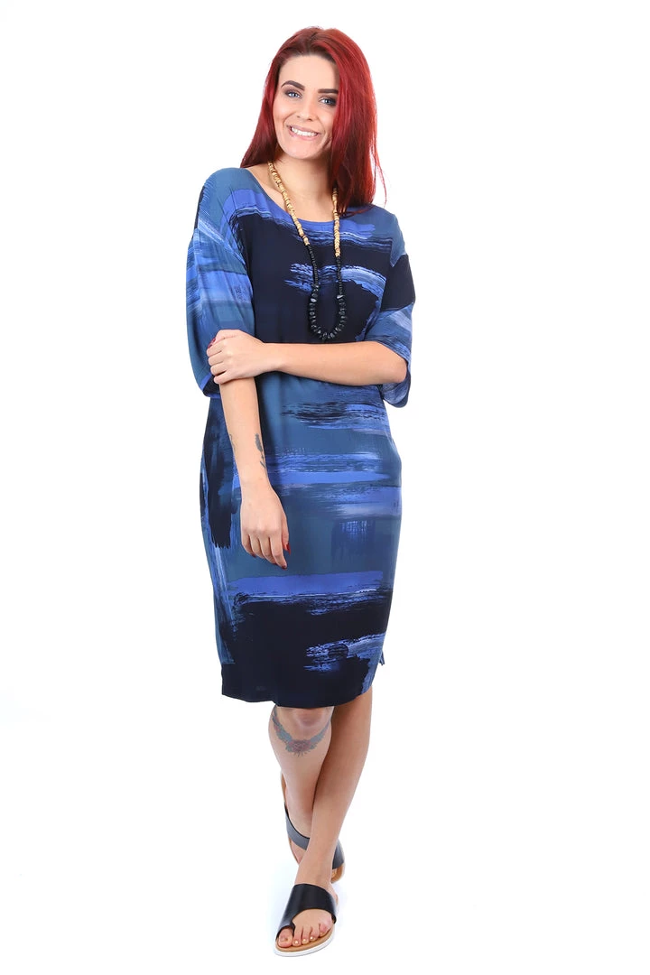 Channel all the worlds greatest artists wearing the Keep It Simple Wedge Dress by Foil. This abstract navy and blue print, Van Gough inspired dress is easy to wear and easier to pair with your favourite shoes. The relaxed fit, paint brush pattern, simple sleeve and knee length finish make the Keep It Simple Wedge Dress by Foil a winner in the warmer weather!