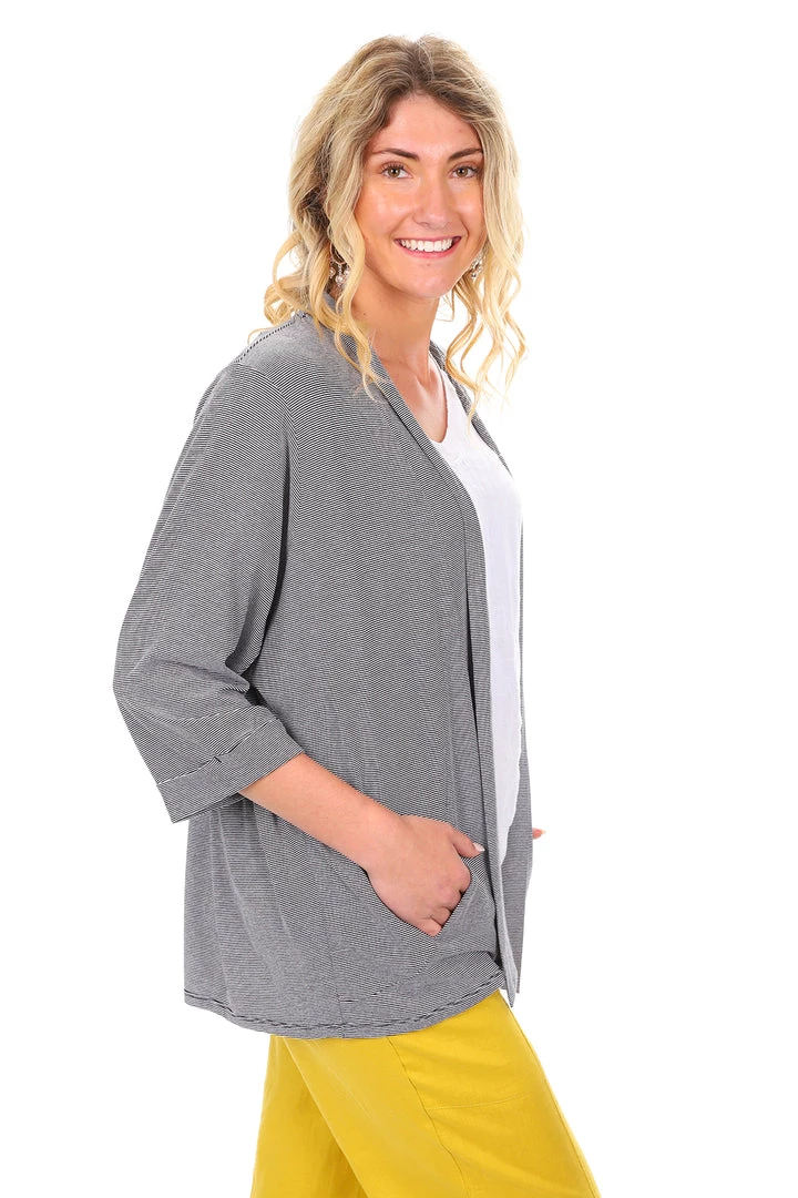 This black and white stripeĀ cardigan by Foil is aĀ sweet, soft necessity – the Subtle Statements JerseyĀ CardiĀ takes a beautifulĀ drape flatter all figures. Perfect with a cotton tee andĀ jean!