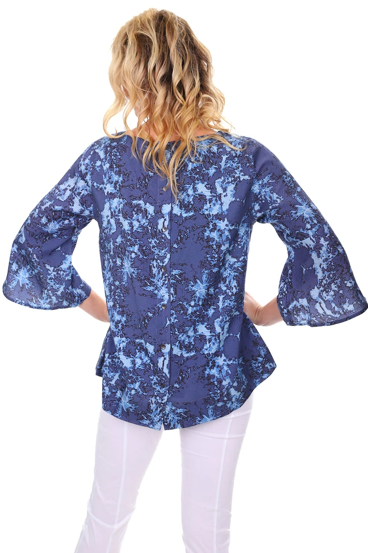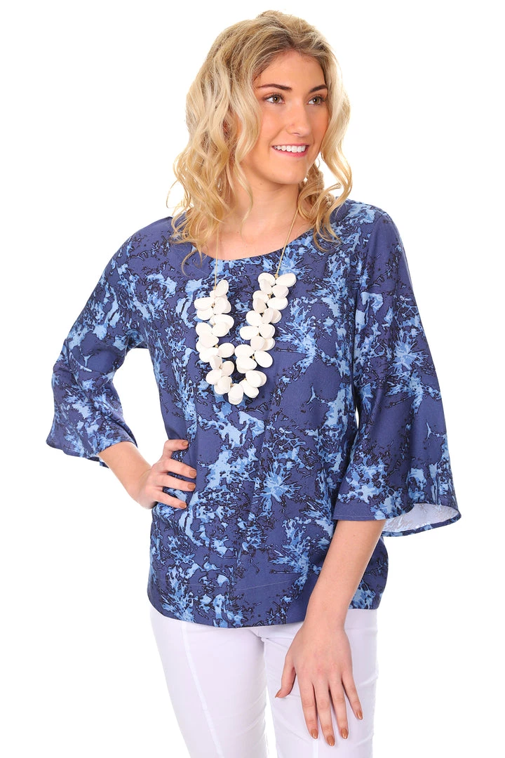 Live your best life wearing this Fresh Start Top in Tie Dye blue by Foil. With subtle frill 3/4 sleeves and a clean rounded neckline this ocean blue top will pair effortlessly with white, blue or black jeans and lends its self to a statement necklace!Â