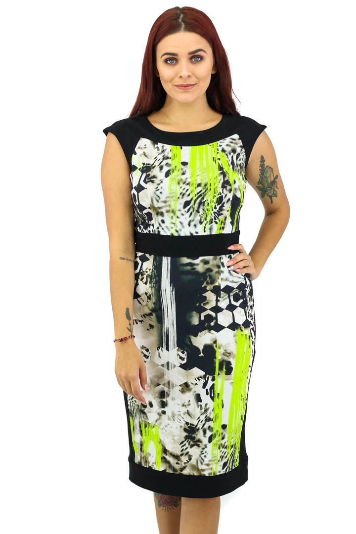 Frank Lyman dress features scoop neck, capped sleeves & a striking green abstract pattern along with a thick stretch material in a knee length fitted style. Perfect accompanied with heels to get you in preparation for that special occasion.Â