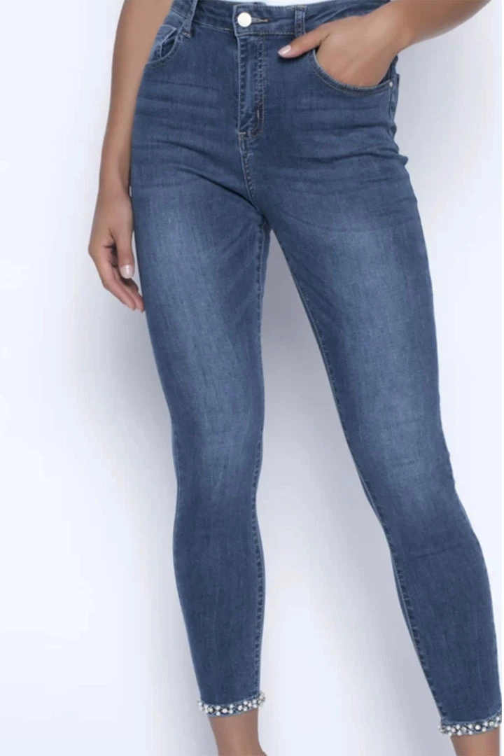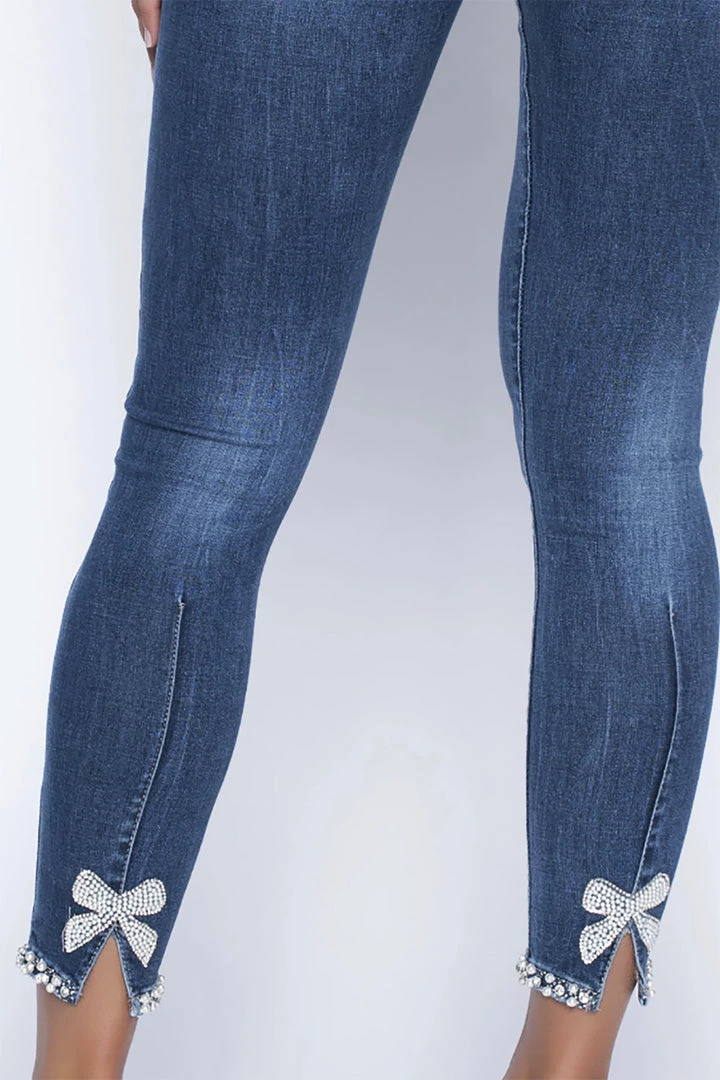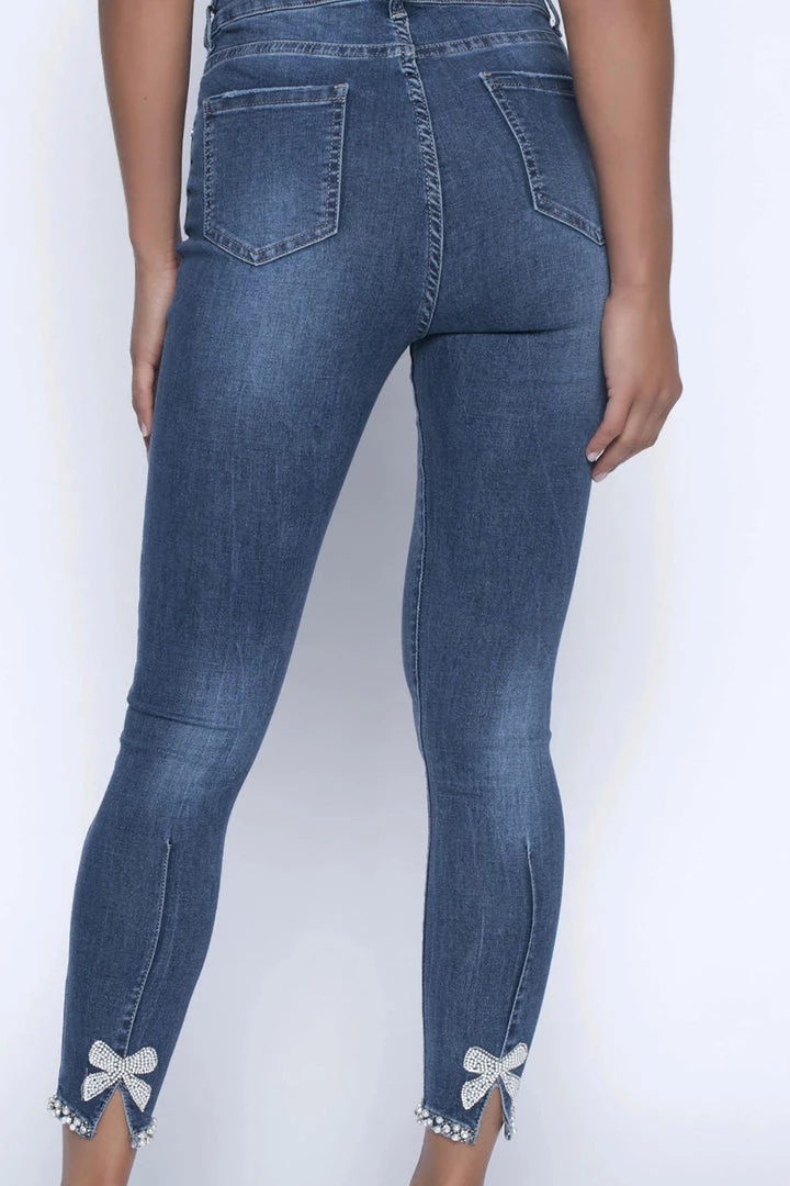 If you are looking for a designer jean these Frank Lyman jeans may just be what you are looking for. They feature delicate diamante Bows on the back of the cuff with faux pearl & diamante trim, The fit is flattering, with a comfortable high waist. These jeans are perfect to take you into the night.Â