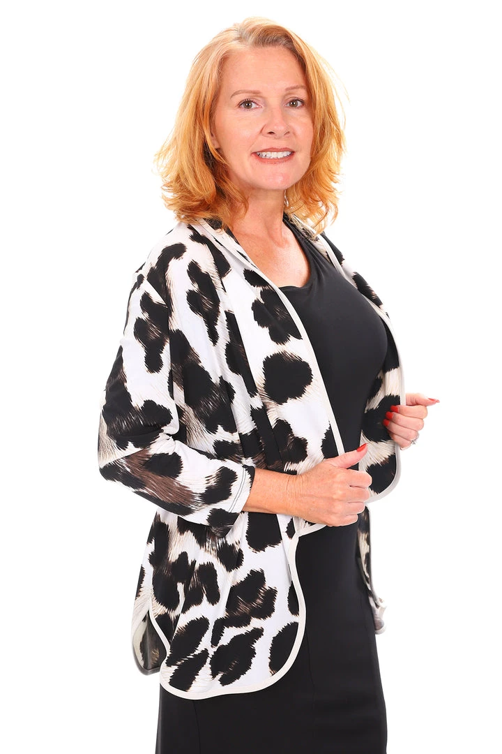 You will be elegant and stylish without a crease in this easy wear Frank Lyman designer Leopard print jacket. The timeless print will take you easily from day into night from a casual catch up at a bar to dressed up for a wedding this jacket is a seamless addition to your wardrobe. Its classic lines mean that it will never date. Team with a classic black pant and black patent heels for a timeless look that will capture every eye in the room.