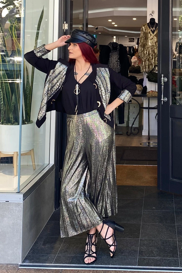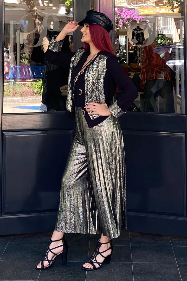 Step out in style to your next formal event in this stunning evening jacket by designer Frank Lyman. Team with a classic black pant and you will be the style setter at any event. Designed and made in Canada this is a quality piece that will stay in your wardrobe for years to come. The jacket features a sparkling fabric which is embellished at the front and metallic faux closures and hidden hooks and eye closures.