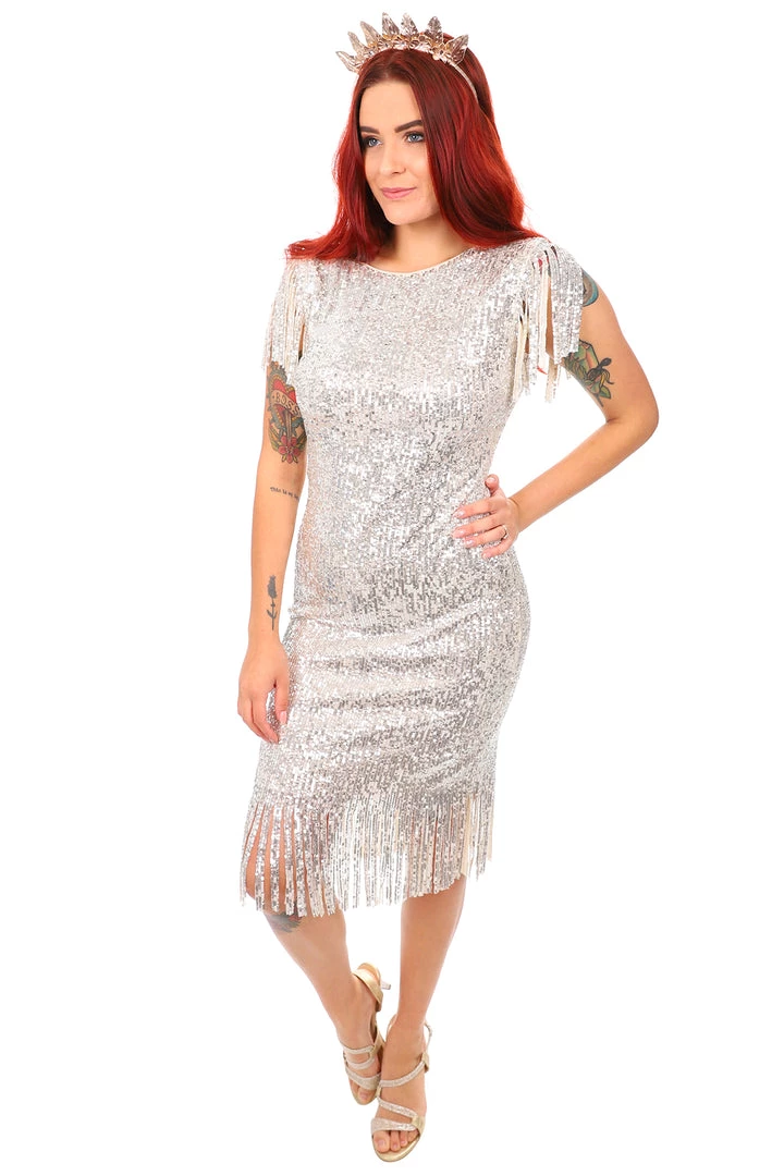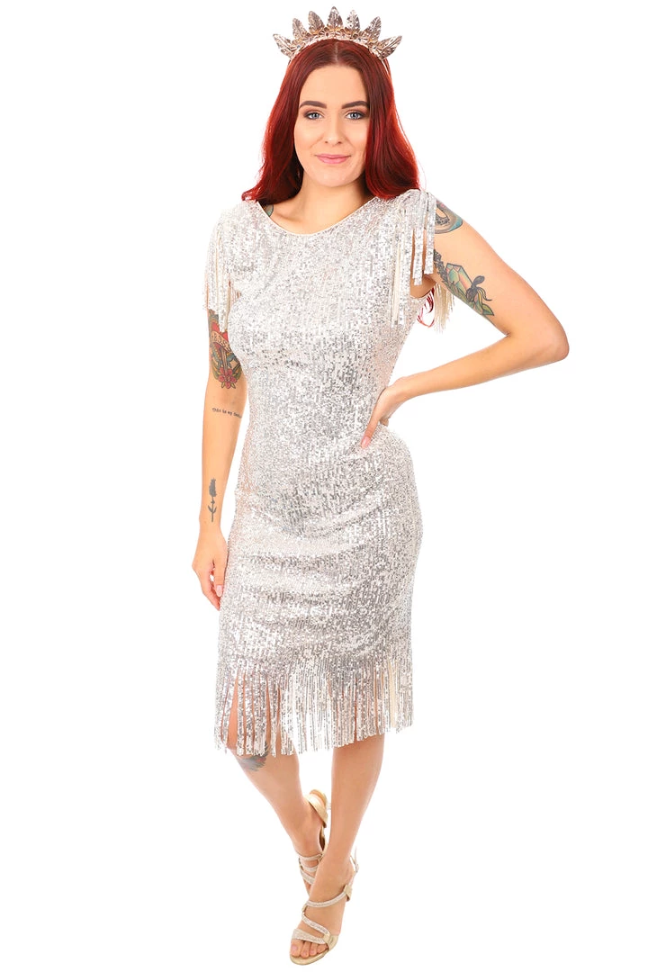 Get a little glamorous in the Sparkle Tassel Dress in Cream by Frank Lyman. Radiating major Gatsby vibes this cream silver dress is fitted, caressing you with sparkle from every angle. Add a heel to compliment the fringe hem and tassel cap sleeve. Perfect for weddings, parties and events!
