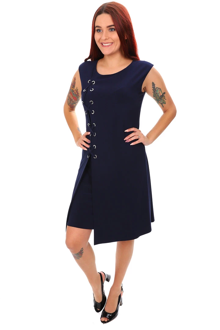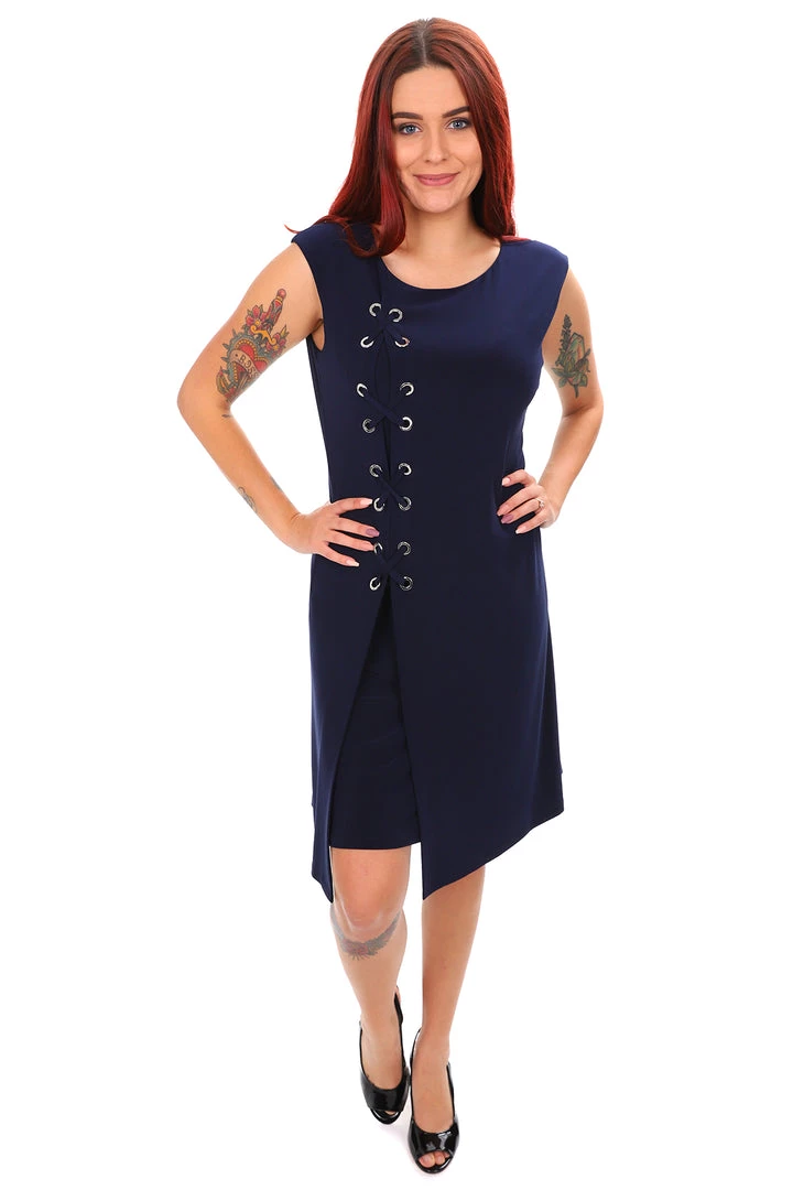 A sleek cocktail dress with a twist – the Eyelet Dress in Navy by Frank Lyman takes silver hoops and creates a figure flattering sleeveless cocktail dress!! Perfect with a nude pump and smokey eye!Â