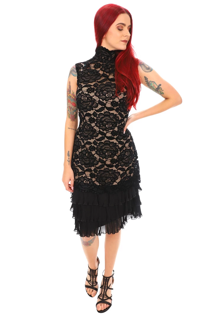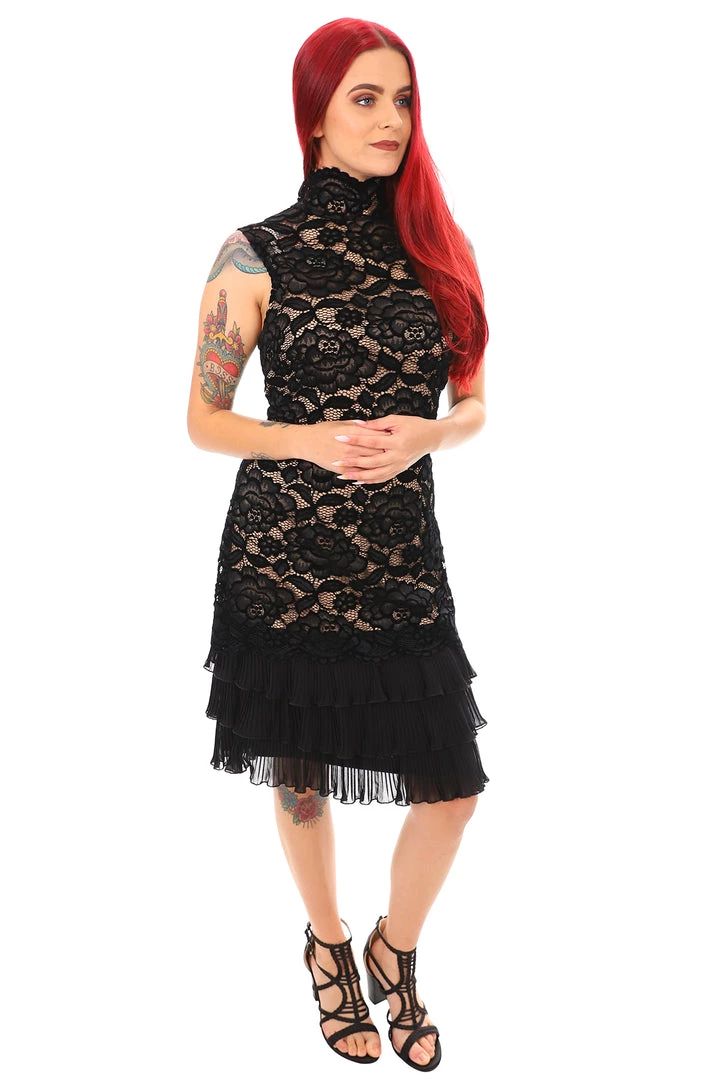 This dress exudes style and flair. With its chiffon fluted flapper hemline and delicate velvet burnout lace it is classic and stylish. The high neckline is elegant and the contrast lining highlights the delicate lace. This dress is perfect for any formal occasion and will look stunning when worn with a patent high heel sandal.