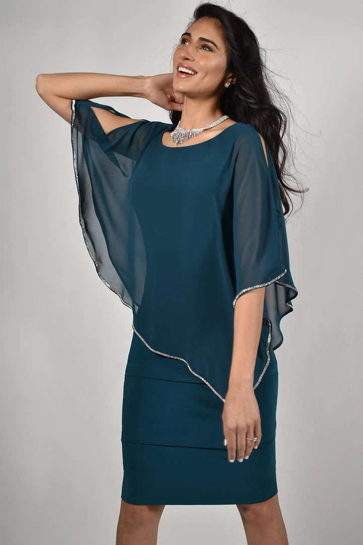 The Stunning Jewelled Cape Dress is a style to flatter every figure, The Jewelled dress is a timeless feminine design with a soft chiffon cape, diamante edging and a Ruffled skirt, this dress will turn heads every time you walk in to an event.