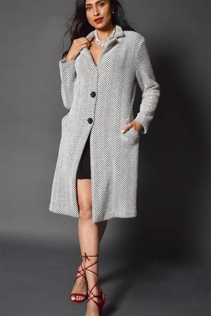 The beautiful long knit button coat by Frank Lyman in black/white Herringbone is just a winner for this season, with front button feature you can wear this coat open or closed for extra warmth, this knee length coat also has front pockets & an oversize V neck collar.