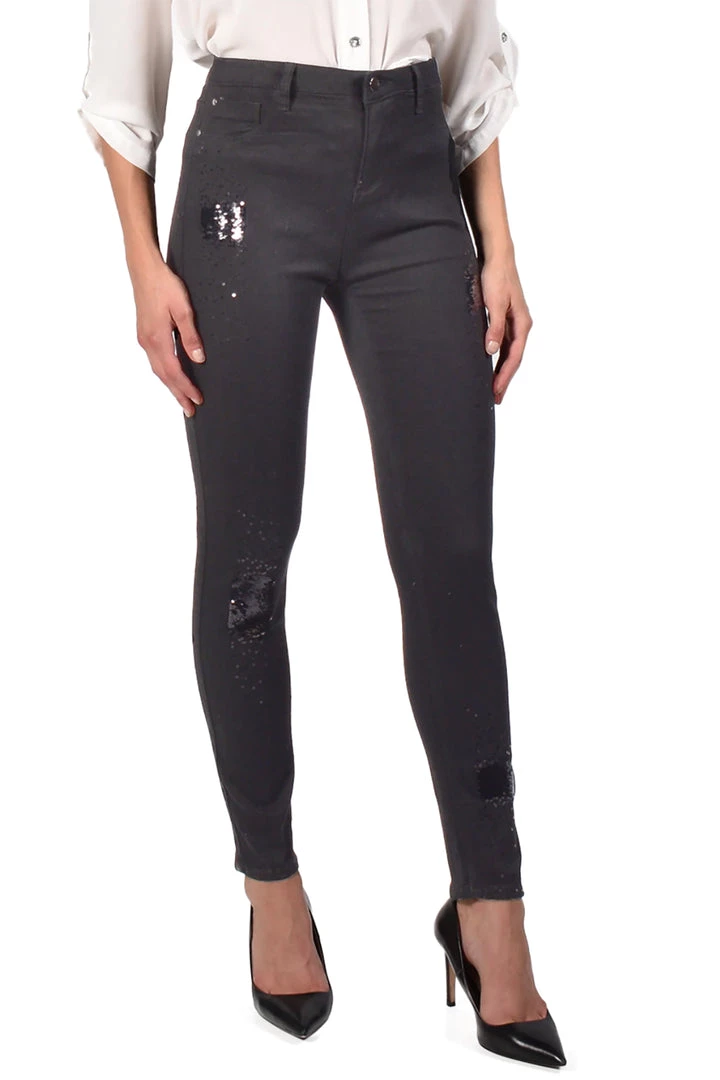 Slip into your new favourite jeans with confidence wearing the sequin patched Jeans by Frank Lyman. These black jeans have a stretch that makes all day wearing a dream! Brought to life through the 3D black on black sequin detail down the leg these easy fit jeans are versatile & designed for real women with vibrant lives!Â