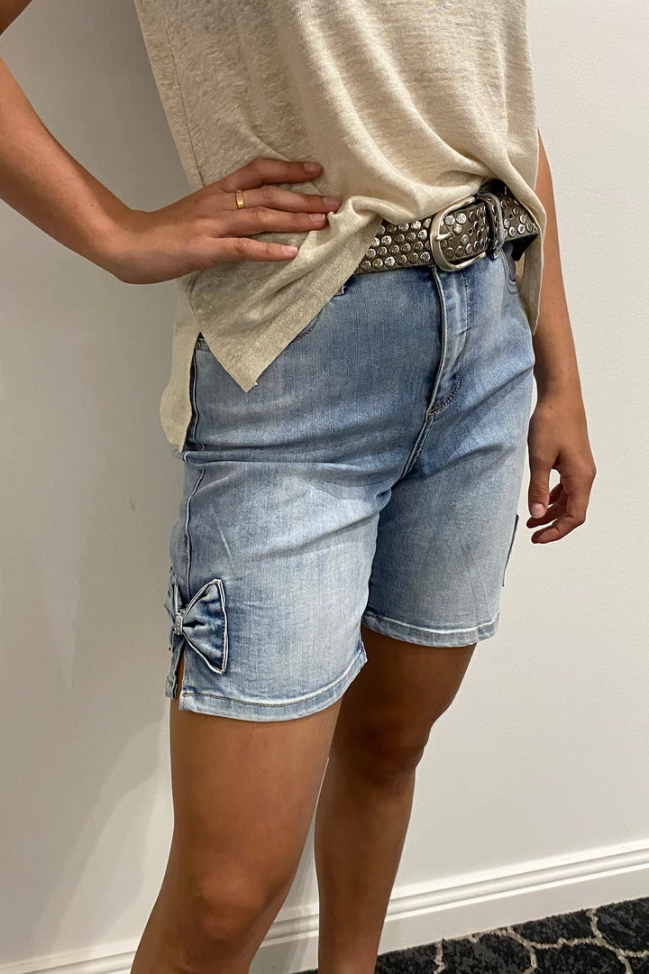Style and comfort from Frank Lyman. These light denim shorts are so easy to wear. The denim is soft and the high waist gives a nice shape. They feature 5 pockets and a Sweet bow on the cuff embellished with crystals. Dress up with a heels or down with a sneaker. Easily paired with any white top for that classic look. Try R1, FL10.Â