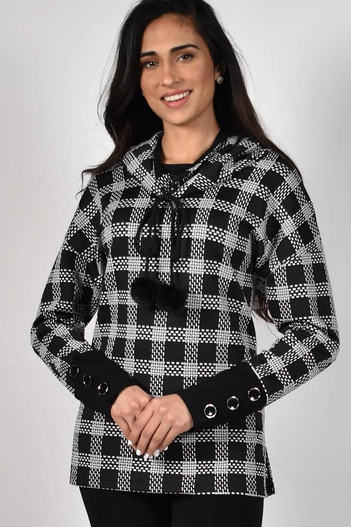The Frank Lyman Hooded Top, is the ideal must have plaid sweater. The Drawstring pom poms and black solid cuffs with button is what makes this top unique. Wear it day or night, this top transitions easily into your needs. Be bold this season!Â