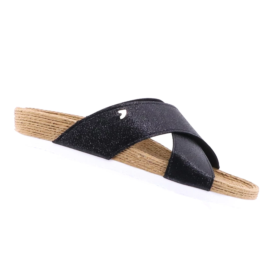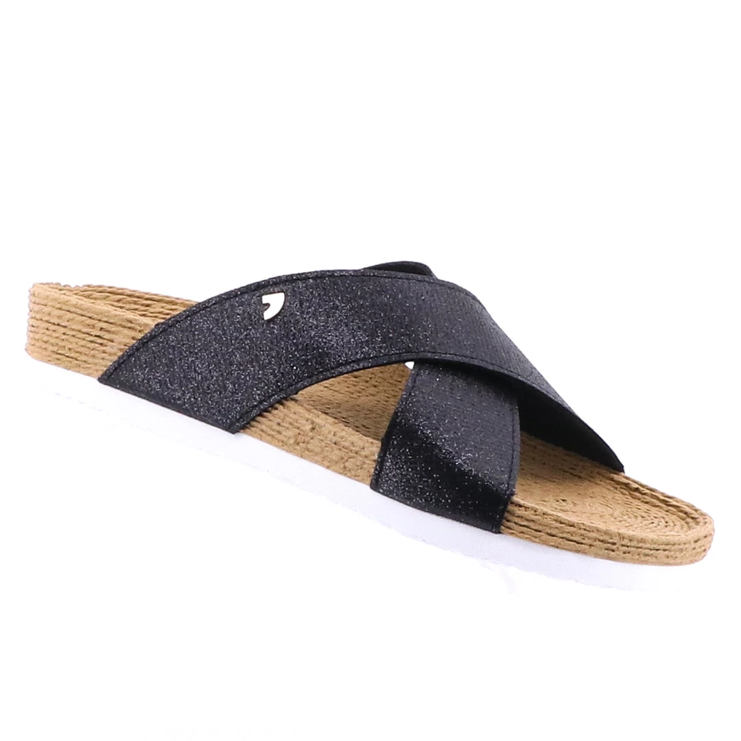 Welcome to the Mecca of comfort sandals that is Gioseppo! The Frejus Slide Sandal in Black black by Gioseppo is a European beach holiday you can wear! The cross over foot straps offer support and comfort. Their sparkle adds a touch of Pizazz to the woven look base. With foot and arch support these amazing Gioseppo sliders are a wardrobe essential this season!