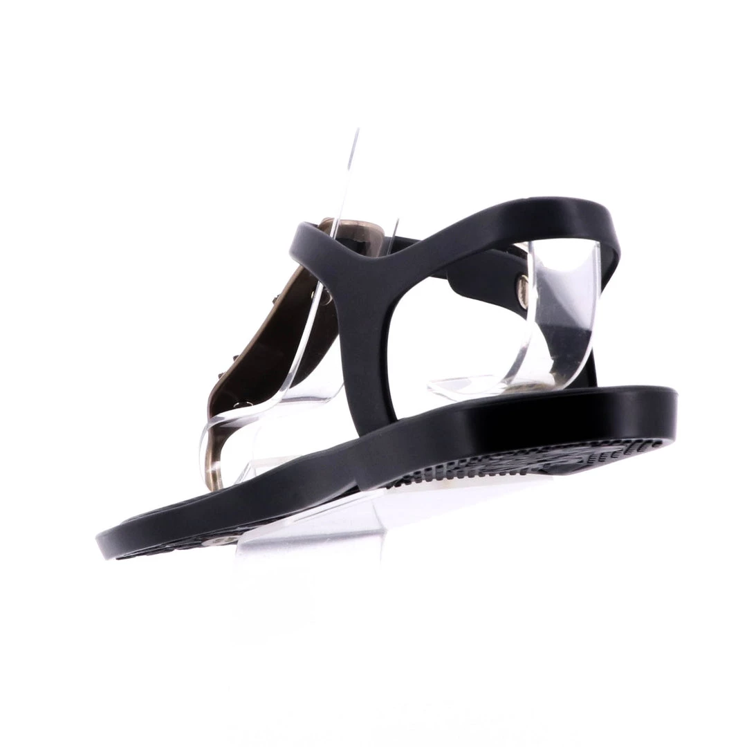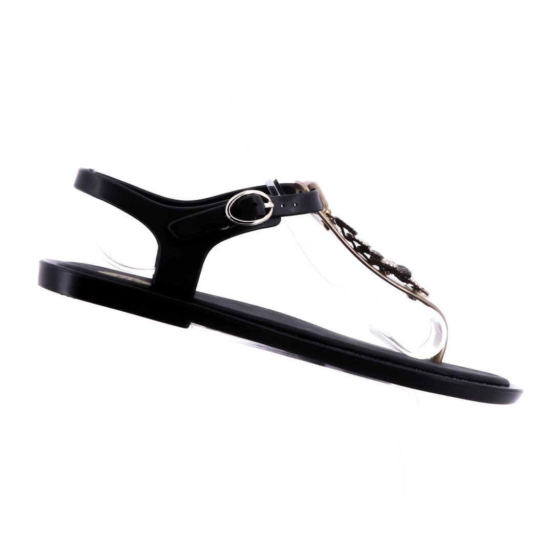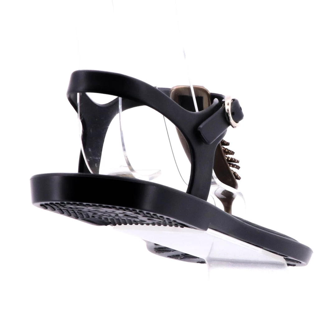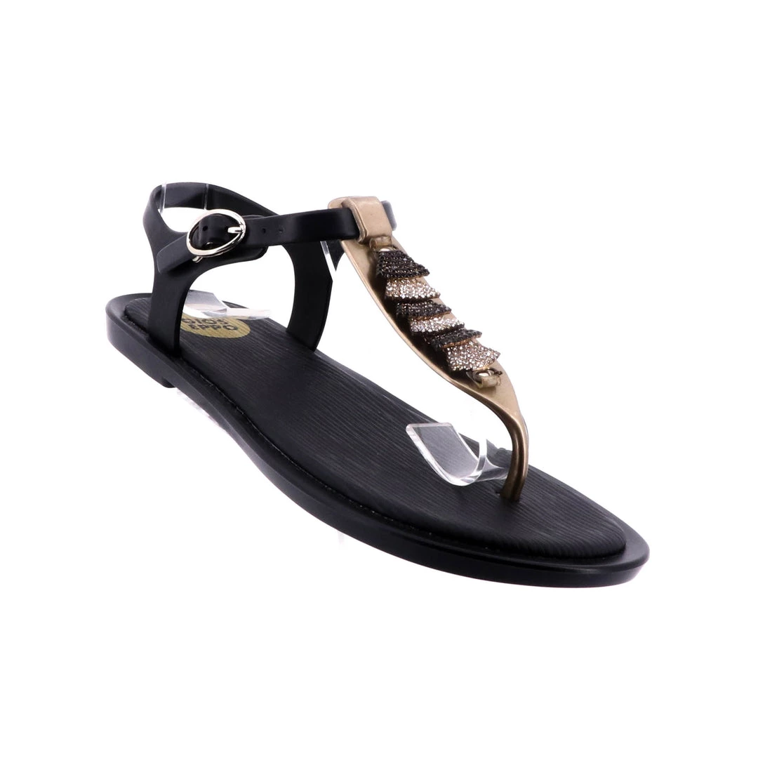 Black thong flip flops detailed with gold embellishments on the front strap. Ankle strap closing. Padded Insole. Upper and insole in synthetic material.