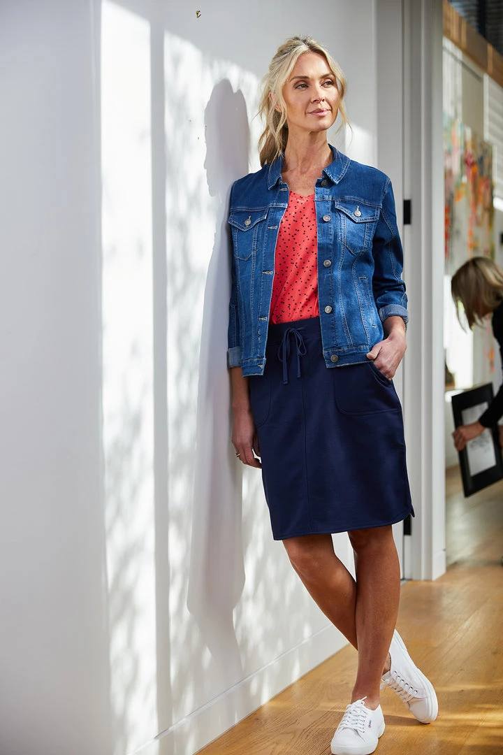 The ruffle hem skirt from Gordon Smith is one of the best selling skirts. Styled in their signature washer finished linen. The skirt is pull on with a soft waistband. Front pockets with stitched pocket bag detail. Back yolk and patch pockets. Raw edge ruffle trim at the hem. Will sit knee length on most.