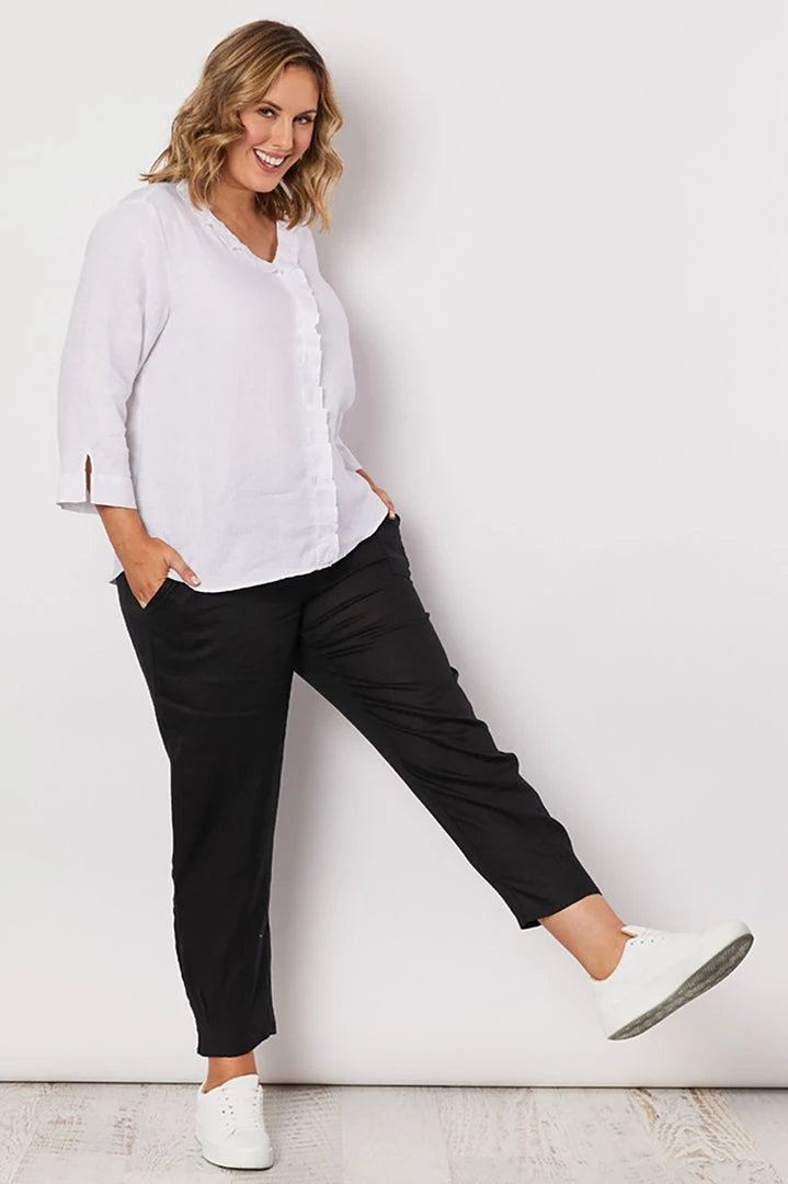 Refresh your off duty basics with these 7/8th cut off jersey waist White linen pant by Gordon Smith. In a refreshing black linen these easy fit pants boast a pin tuck detail hem, handy side pockets and a comfortable jersey fabric elasticated waistband! Perfect for every day or smart casual outfit planning!