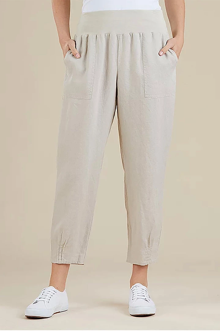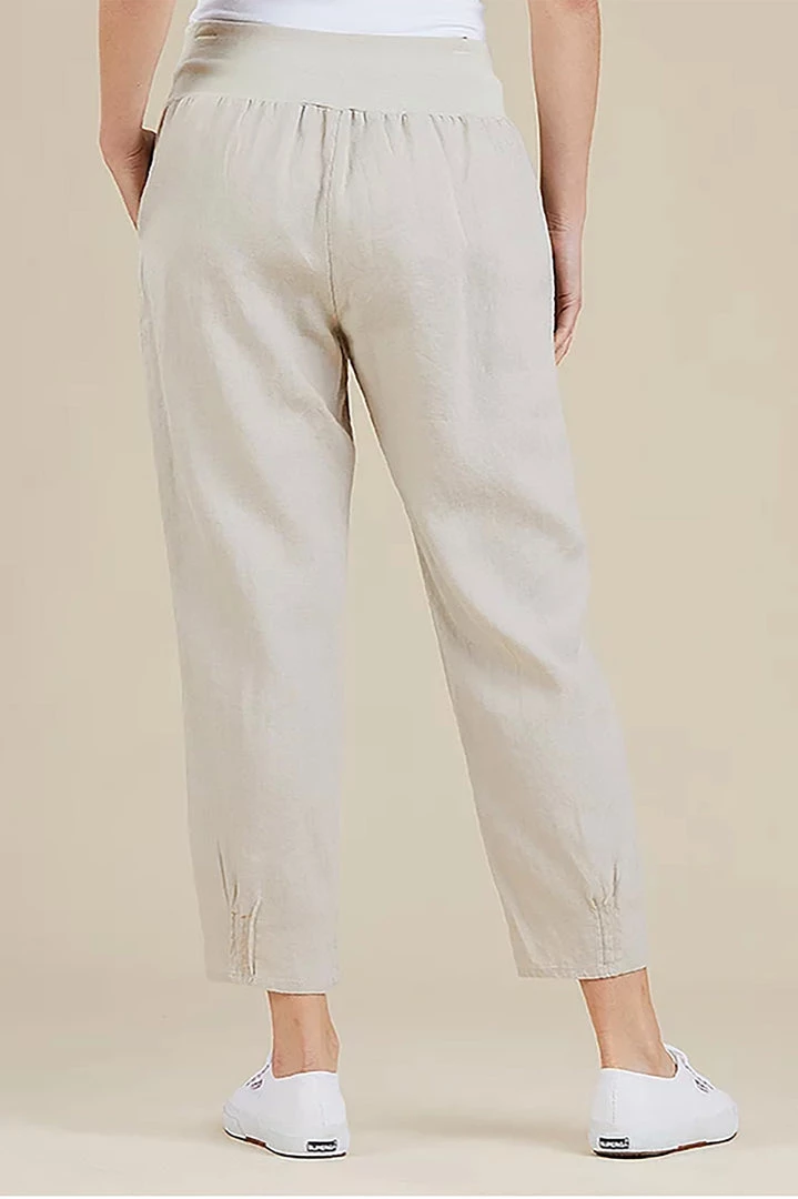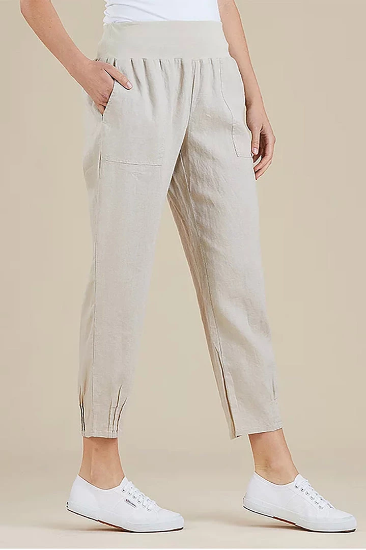 Ā Refresh your off duty basics with these 7/8th cut off jersey waistĀ linen pant by Gordon Smith. In a cool linenĀ these easy fit pants boast a pin tuck detail hem, handy sideĀ pockets and a comfortable jersey fabric elasticated waistband! Perfect for every day or smart casual outfit planning!