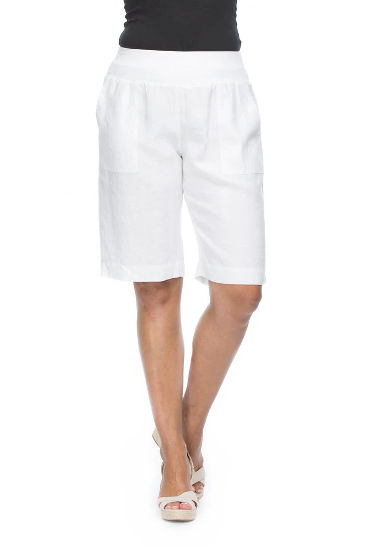 Refresh your off duty basics with these knee length pull on jersey waist linen shorts by Gordon Smith. In a cool linen these easy fit shorts boast a small side split hem, handy side pockets and a comfortable jersey fabric elasticated waistband! Perfect for every day or smart casual outfit planning!