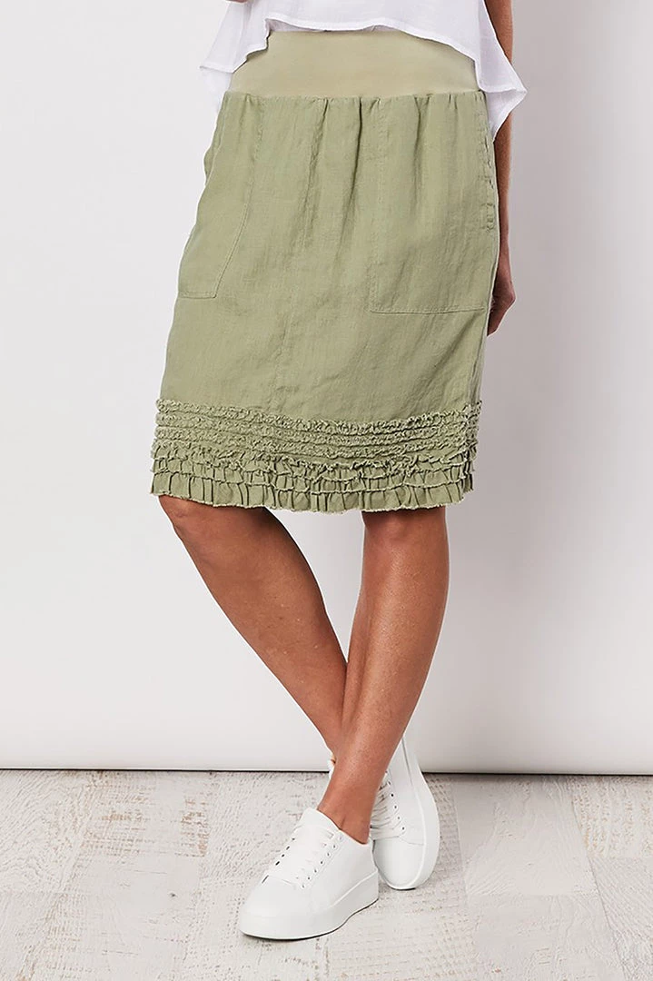 The ruffle hem skirt from Gordon Smith is one of the best selling skirts. Styled in their signature washer finished linen. The skirt is pull on with a soft waist band. Front pockets with stitched pocket bag detail. Back yolk and patch pockets. Raw edge ruffle trim at the hem. Will sit knee length on most.