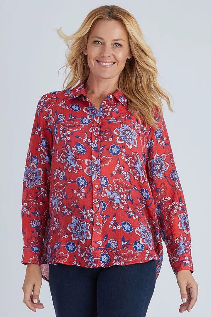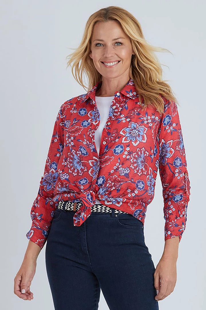 ress when you wear this shirt. Dress this up with a red long pant and a long black boot or go with a classic navy jean and choose a leather sneaker that highlights one of the colours from the beautiful floral pattern.