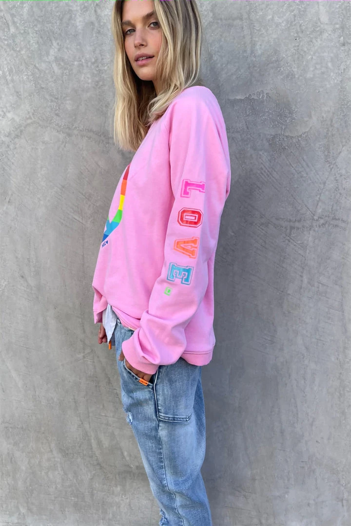 Our new Sporty Peace sweat is a lightweight unbrushed french terry, With a Multi coloured peace sign on the front chest and multi colour star on bottom of the right arm & multi colour Love down the left sleeve. This style is our boxy fit with added length and the hem is overlocked. Such a great everyday sweat with style.