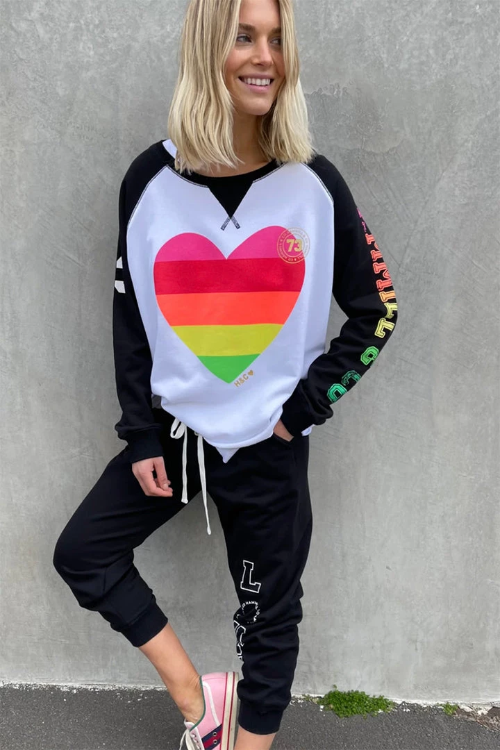 Our new October Sporty Rainbow sweat is a lightweight french terry. Cool contrast coloured black sleeves with crisp white body colour. Multi coloured heart across the front chest and multi colour Hammill & Co print down the left sleeve. This style is our boxy fit with added length and the hem is overlocked