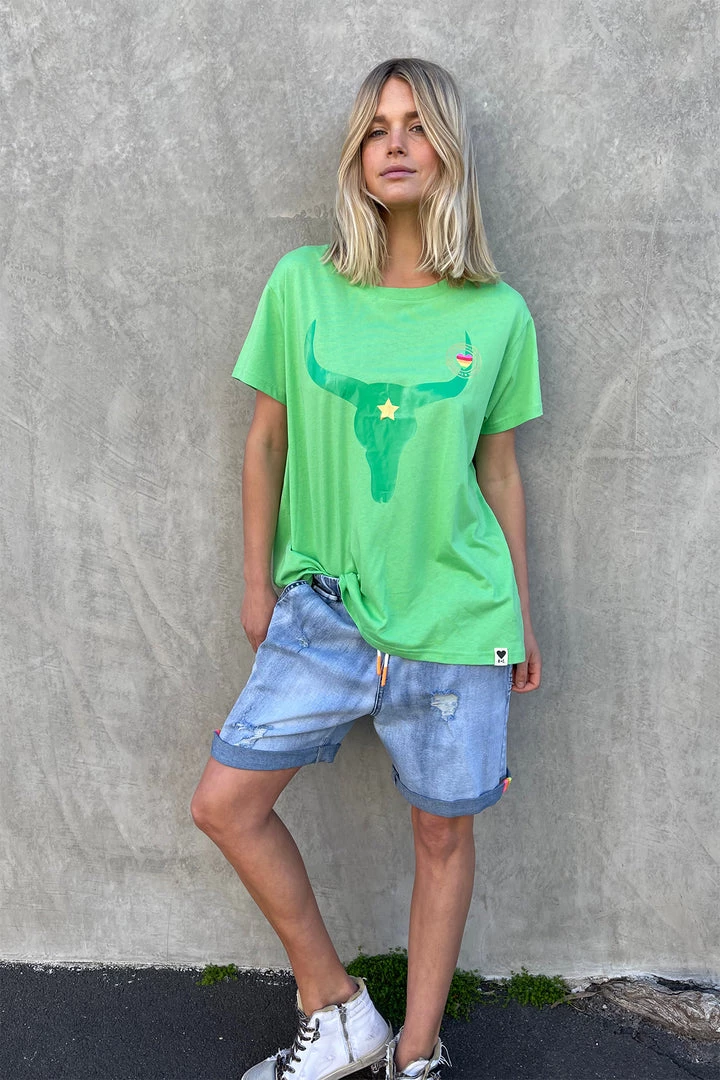 Oversized Crew Neck Tee in Green is the ideal tee for any look, this effortless tee is a super slouchy, oversized silhouette shape with our new bull horn print. Soft cotton jersey fabric. Pair with the slouchy denim short to complete your look.