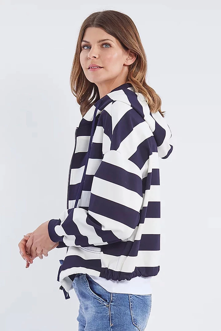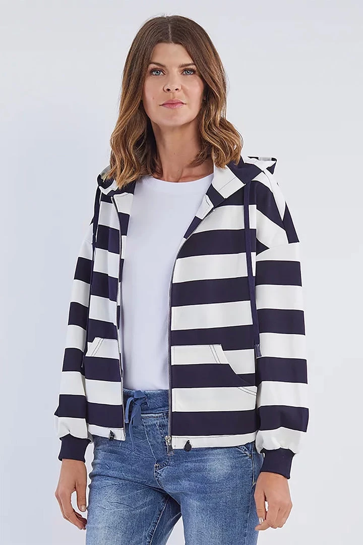 Every woman needs a warm and cozy hoodie for winter and this Hammock and Vine maritime themed striped hoodie is perfect for being warm and stylish. Throw this on over a white tee and light denim jeans with a white sneaker which is perfect for a classic look.Â