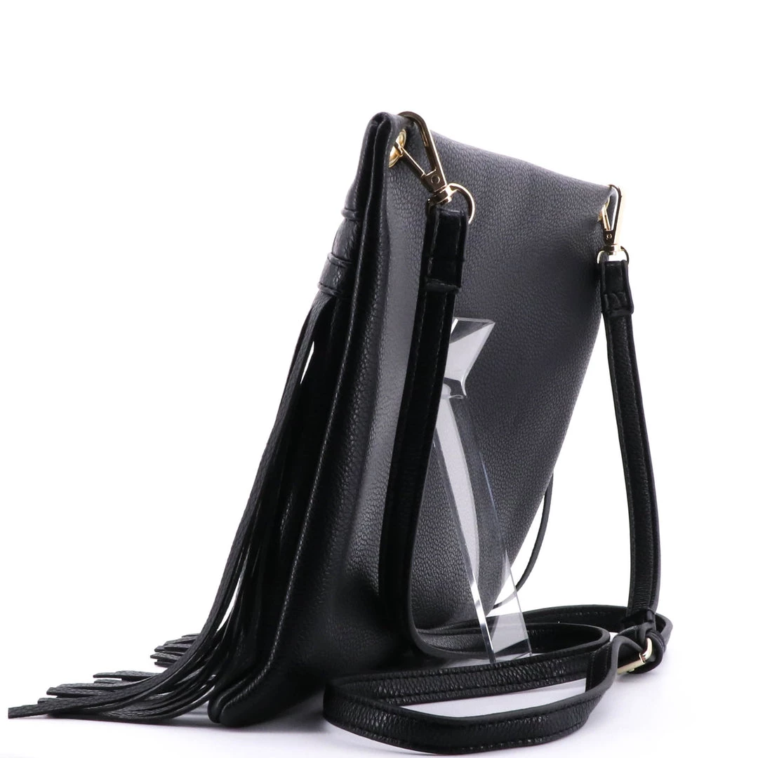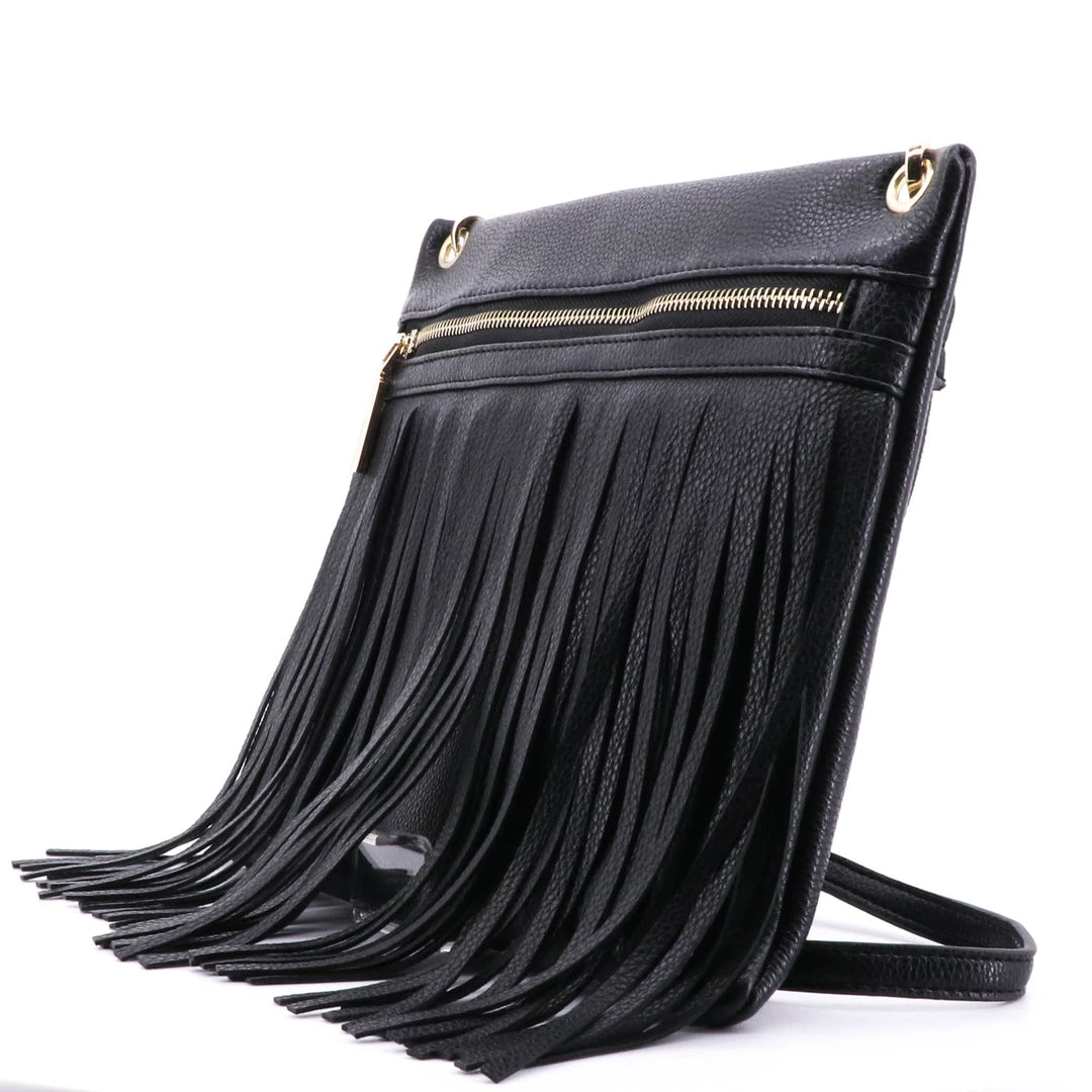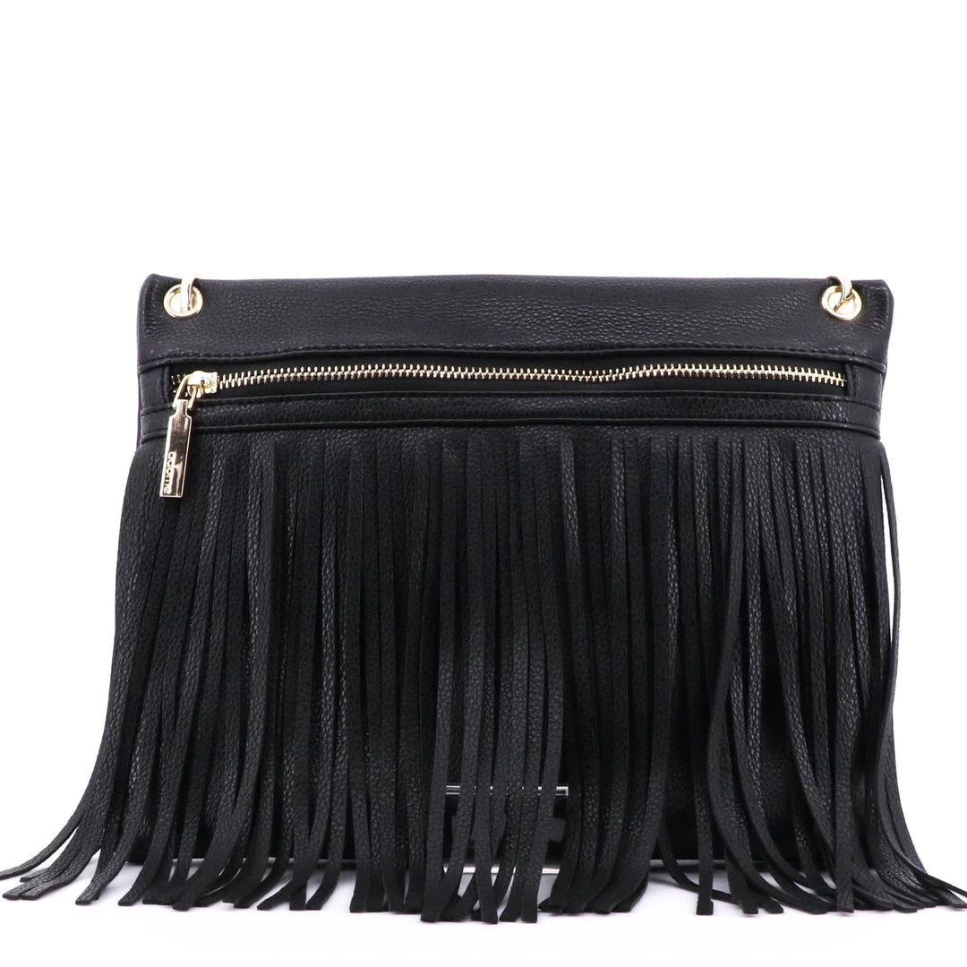 Fringe shoulder bag by Adorne will take you through day or night. Zip pocket inside, gold detailing with removable  adjustable strap.