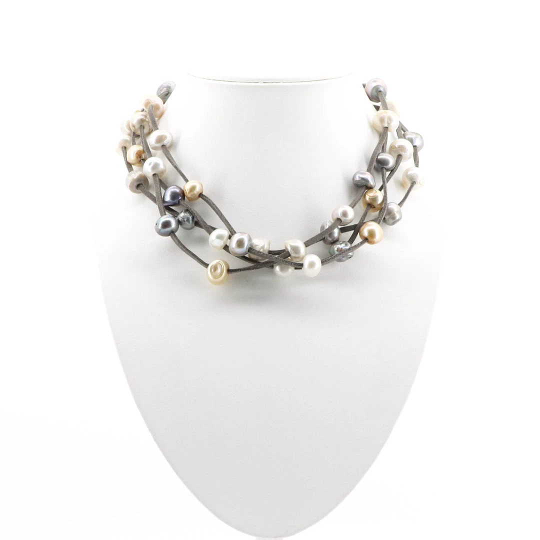 Made of four strands of suede leather, threaded with large and beautiful baroque, freshwater pearls.