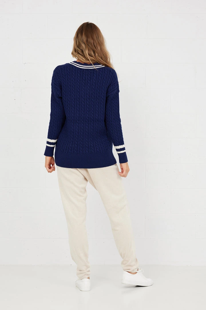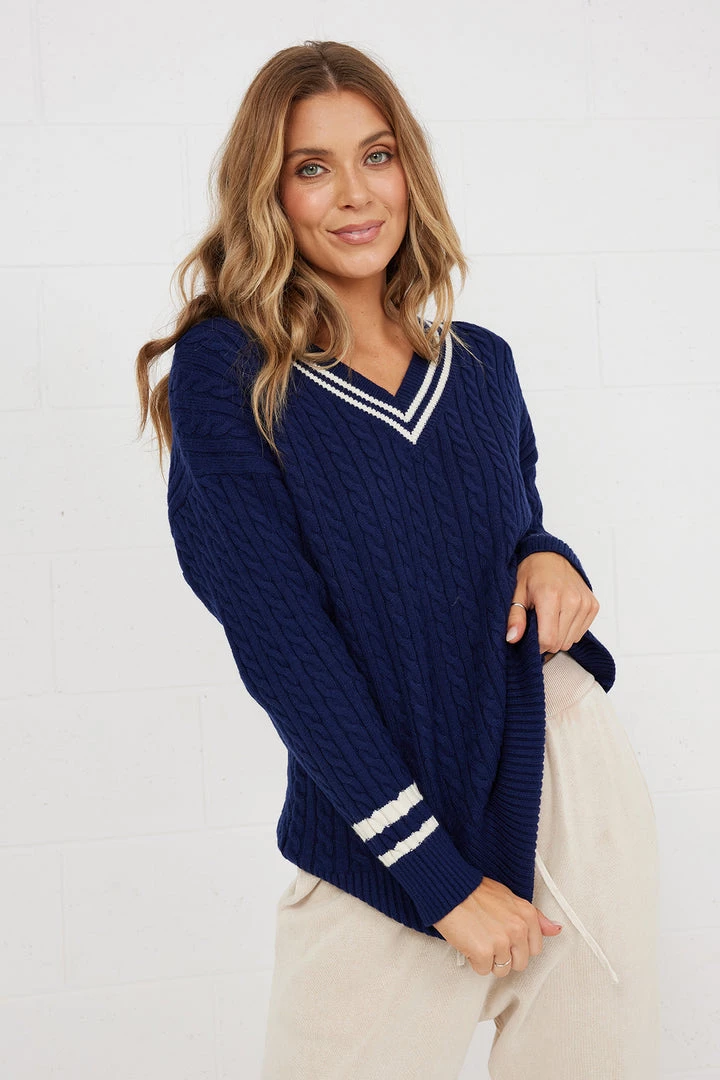 The Waldorf knit is a soft touch thick fabric sweater with stripe details on the cuffs and neckline, this sweater is warm and snug, perfect for layering and pair it with a jean or slacks and sneakers for a transeasonal look.