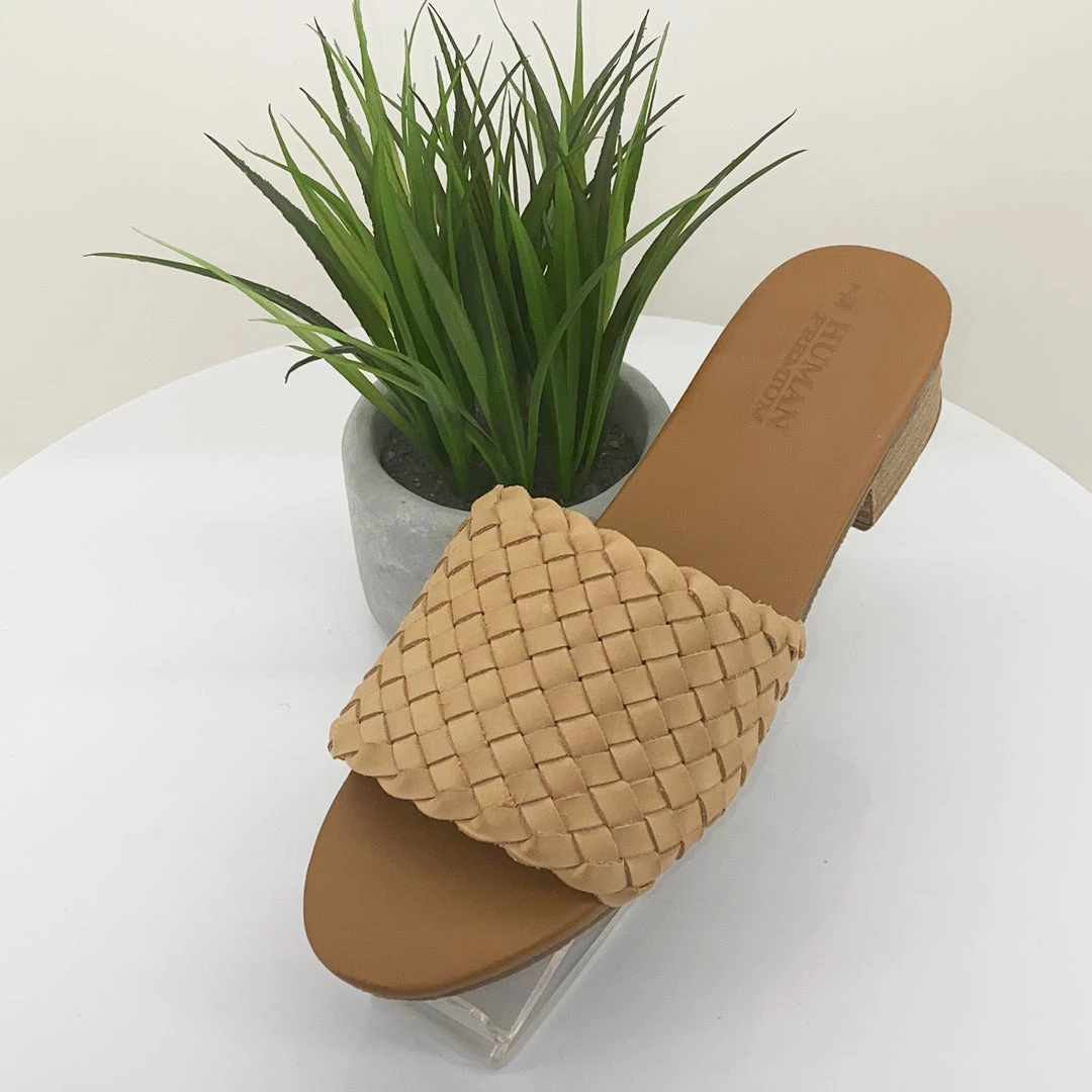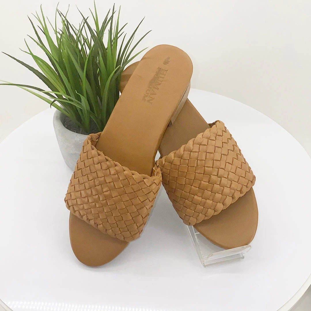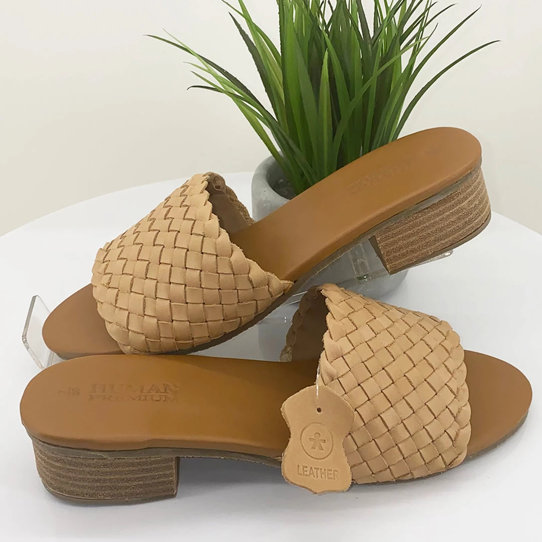 Fall in love with modern footwear thanks to Human Shoes and their woven leather Roni Mule Shoe in tan. With an open toe, leather design and modest heel, these tan leather slip on shoes are an ‘all occasions’ purchase for all seasons!