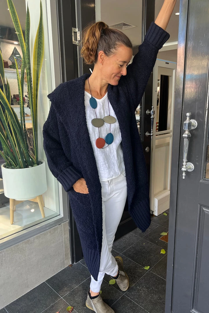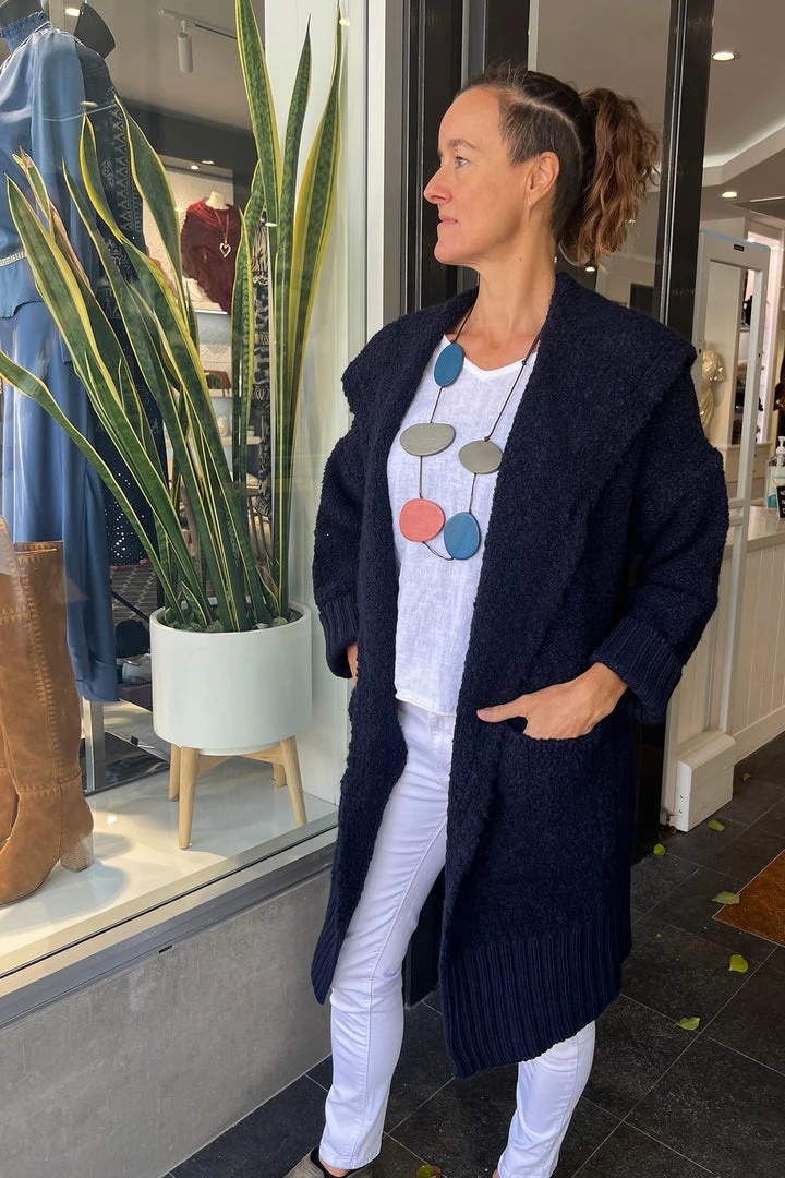 This Betty Boucle Cardi by Italian Star is designed in Italy and offers the latest in European fashions. The fabric is luxurious with a blend of wool, acrylic and alpaca making it soft and snuggly. Team this great hooded cardi with a jean or jogger pant for a timeless casual look that will have you feeling warm all day long.