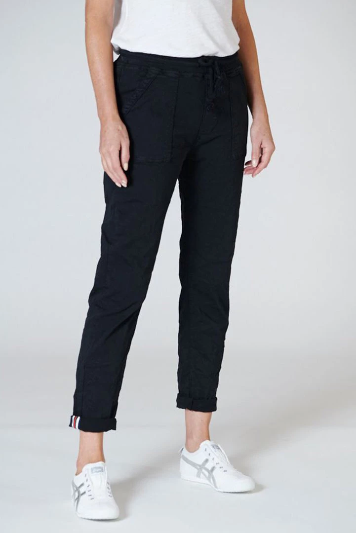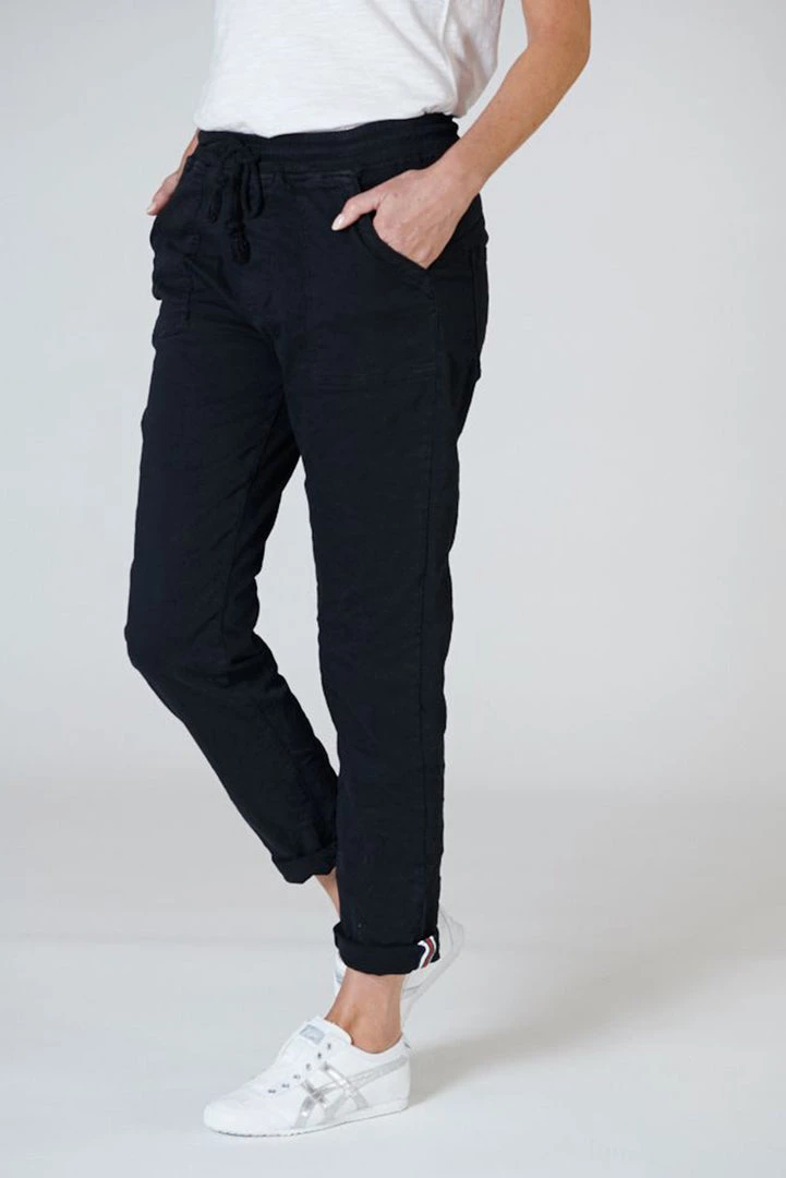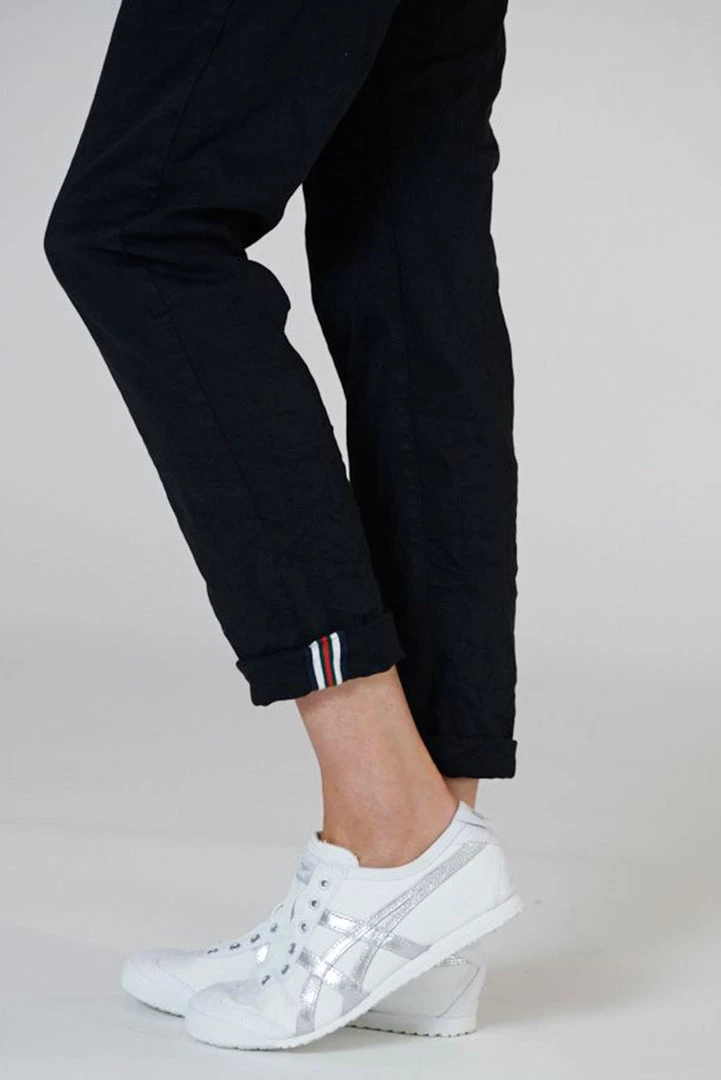 These jogger jeans by Italian Star are perfect for casual days. No one will know just how comfortable you are wearing these black elastic tie waist jogger jeans with a hint of “Polo” on the side seams with a highlight trim featuring bold red, white, navy and red stripes on the reverse side which show your style when you turn up the cuff on these great pants. Team these with your favourite knit and a pair of red leather sneakers for a look that you own.