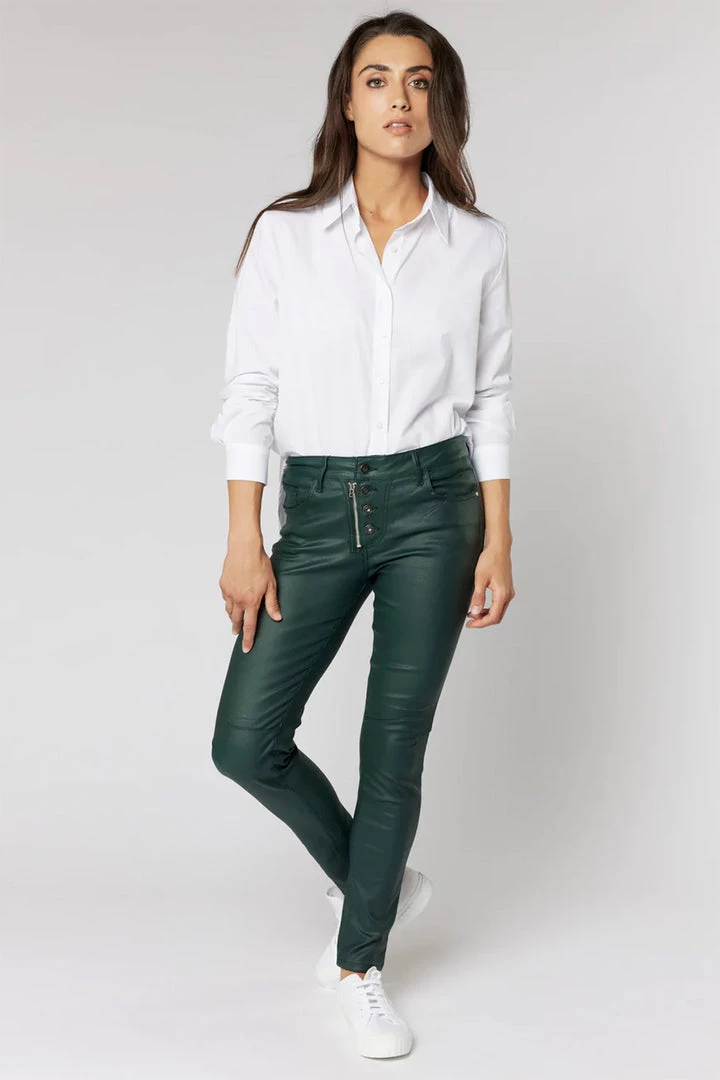 Love the look? The team at Pizazz Boutique love the look of these wax finish jeans. These Italian designed and made Jeans by Italian Star have a high sheen “leather” look. They are great teamed with a casual T and a contrasting leather sneaker or go up a level and team them with some black long high boots for a classic winter fashion look.