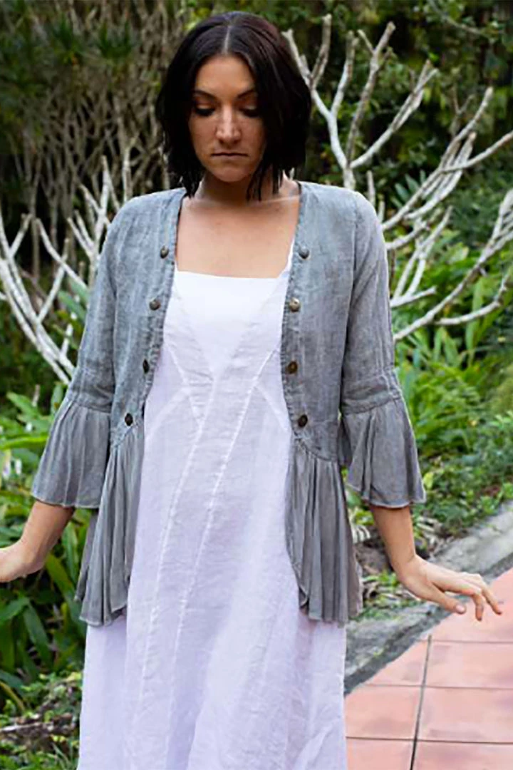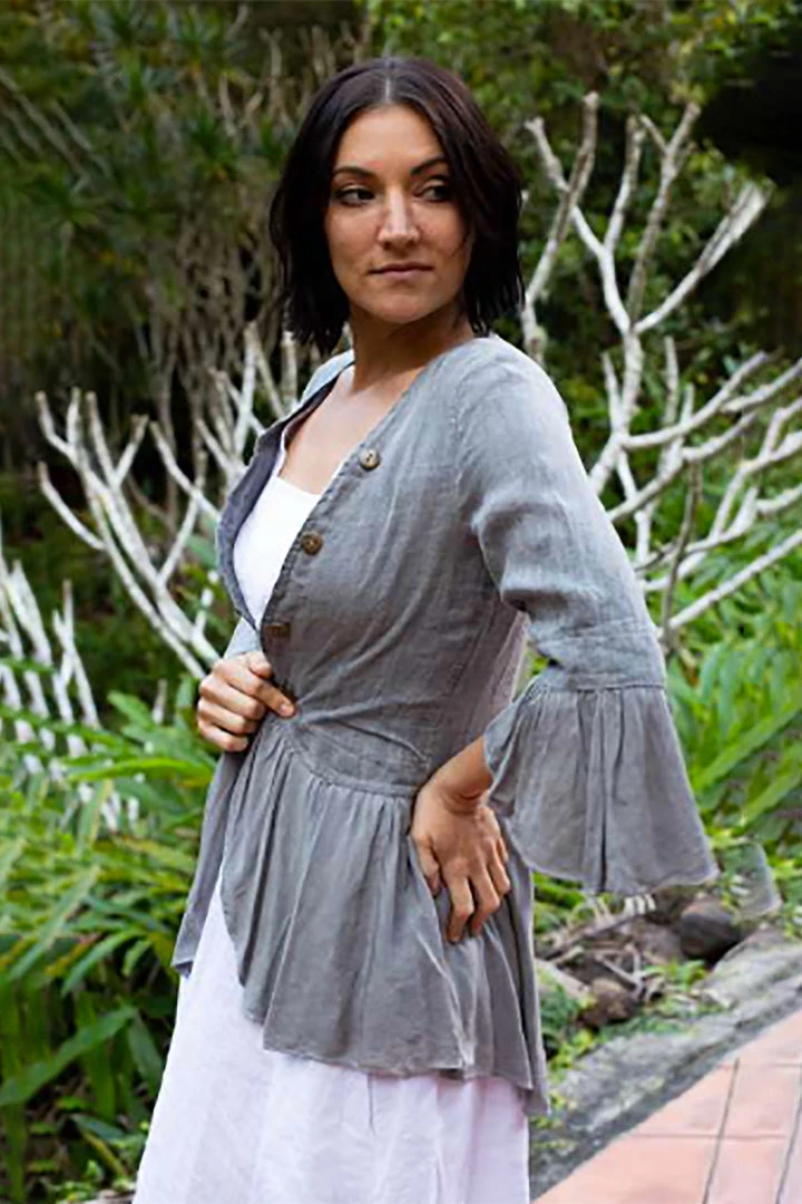 Stand out this season with the beauty of Italian made Jenny Jazz and their statement linen Fleetwood Jacket in Silver. This military inspired, feminine jacket features a beautiful frilled sleeve and hemline made from light and luscious viscose, adding that femininity to the military styled, linen feature. With brass coloured buttons this Fleetwood Jacket is a silver sensation!