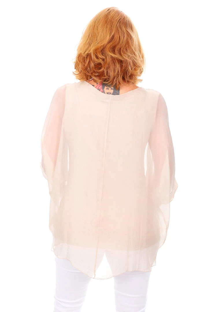 Embrace a life of Pizazz wearing the feminine Primadonna Shimmer Top in Beige by Jenny Jazz! Made in Italy, this amazing white silk and sequin top is class with a touch of sparkle! The short sheer sleeve is highlighted and made all the more feminine by the stunning sequin trimmed cuff and under shirt! Loose and light weight top layer with a fitted cami underneath- Jenny Jazz is designed for wonderful women like YOU!Â