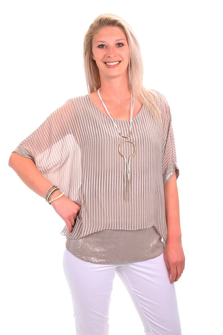 Keep it feminine and glamorous with the Primadonna Shimmer Top in Biscuit and grey stripe by Jenny Jazz! Made in Italy, this amazing silk and sequin top is class with a touch of sparkle! Loose and light weight top layer with a fitted cami underneath. The short sheer sleeve is highlighted and made all the more feminine by the stunning sequin trimmed cuff and under shirt! Jenny Jazz fashion is designed for wonderful women like YOU!