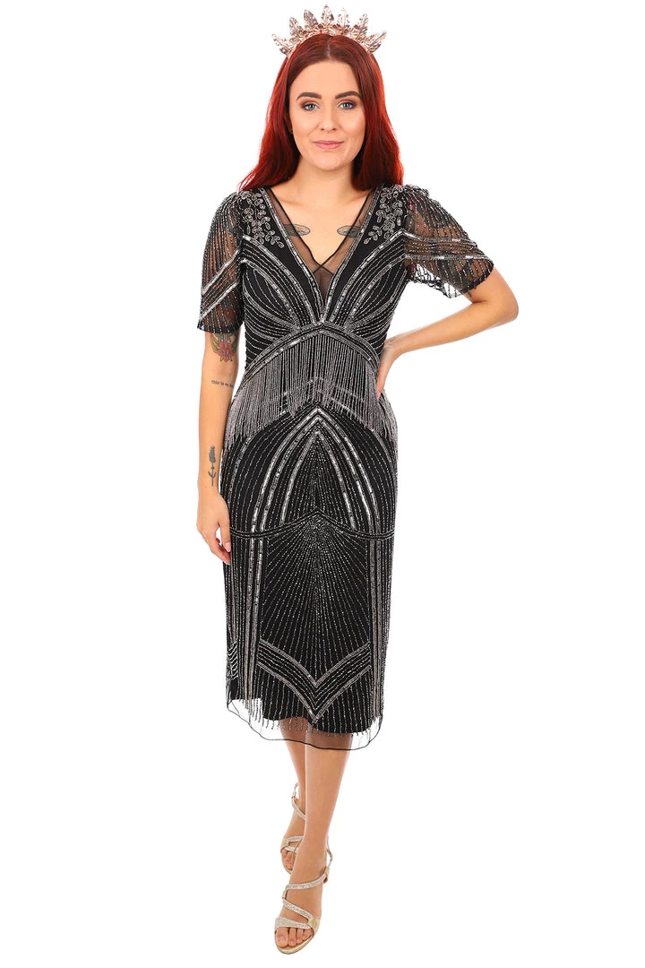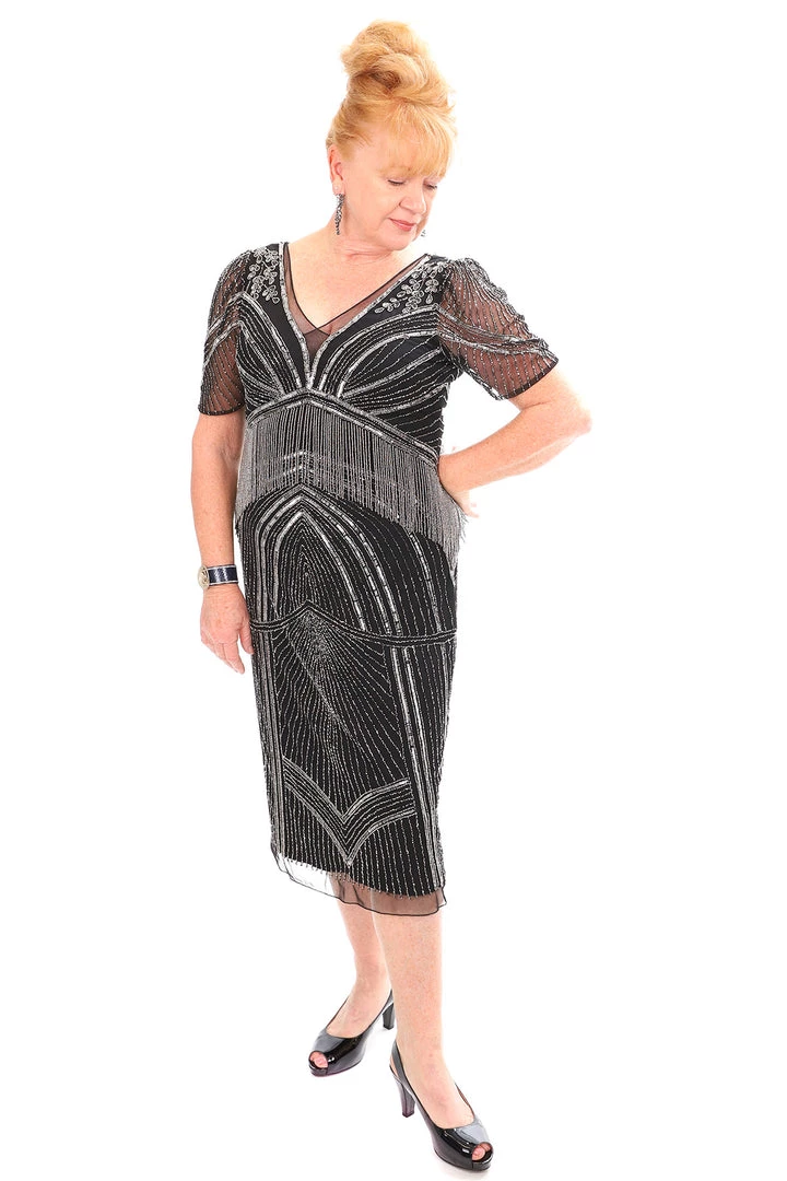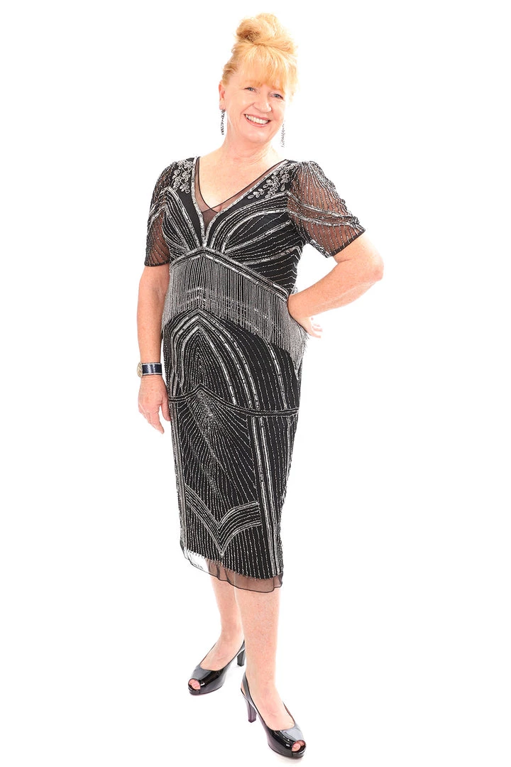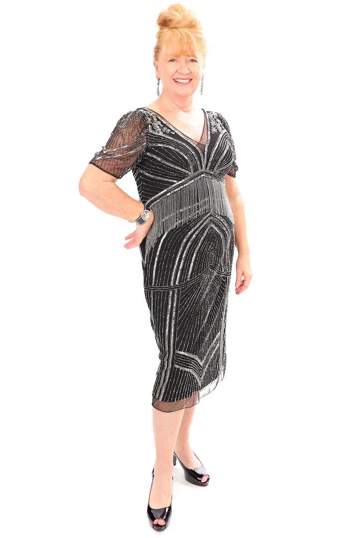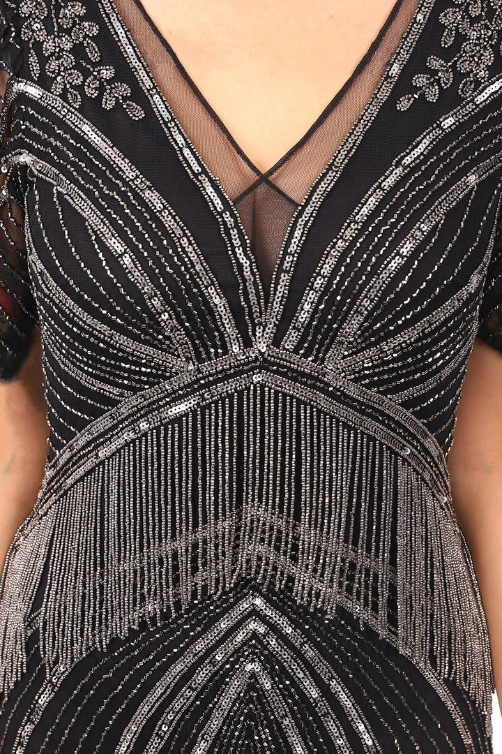 Dripping in diamonds is the way you want to make your entrance to any event this season! The Beaded Queen Dress by Jesse Harper is the statement of all statements – embellished from head to toe in silver sequins and beads. With a V neckline, short sleeve and below knee finish the silhouette lets the detail do the talking!