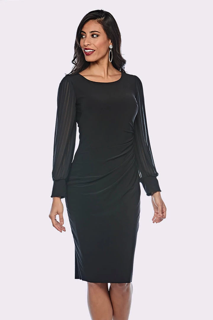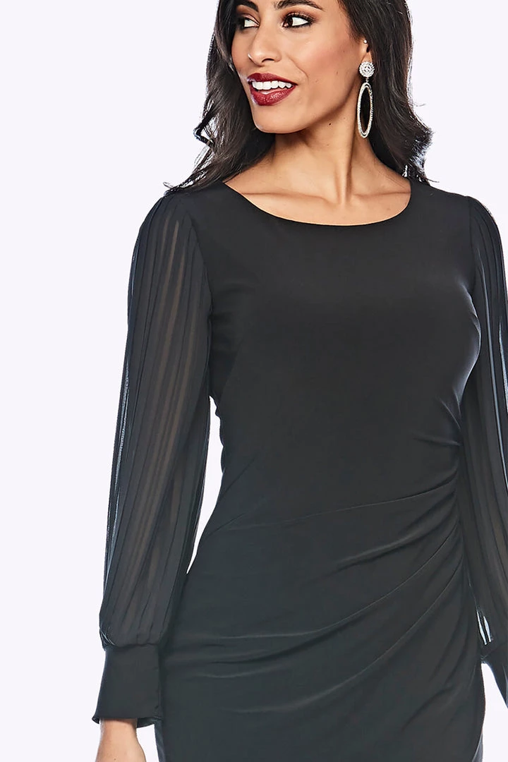 The silhouette shift dress in black is the little black dress that every women needs, this dress will take you from event to event , with ruching at waist and a semi sheer pleated chiffon sleeve and stylish cuff this dress is a winner.