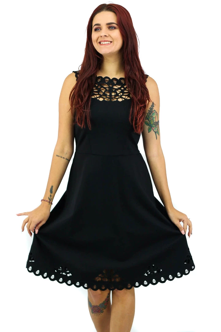 Joseph Ribkoff black dress is a mix of modern and classic style featuring cut-out lace detailing.