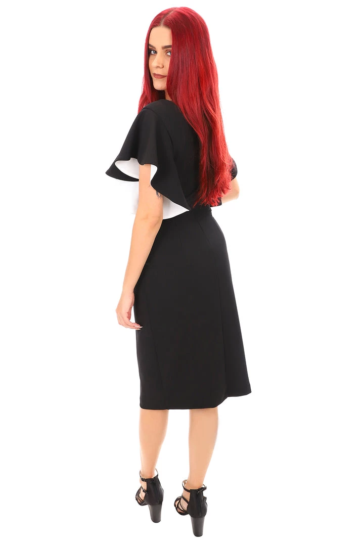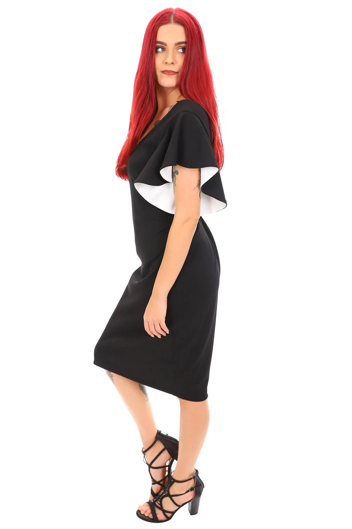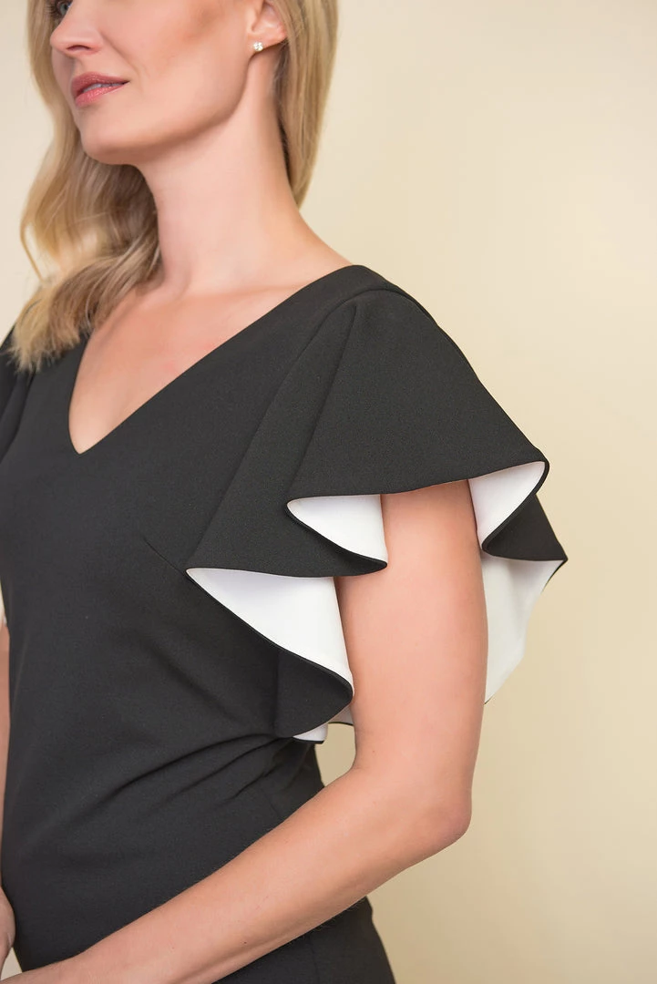 Joseph Ribkoff designer style is yours in this classic little black dress. Made in a lightly stretch fabric this dress has it all including delicate flutter sleeves which are detailed in contrasting white. This statement dress is perfect for any special event or occasion. Team this dress with a black sandal and clutch for evenings or go for a corporate look with a court shoe and black and white tote bag. This is a piece that you will have in your wardrobe for many years and you will look and feel special in it every time you wear it!