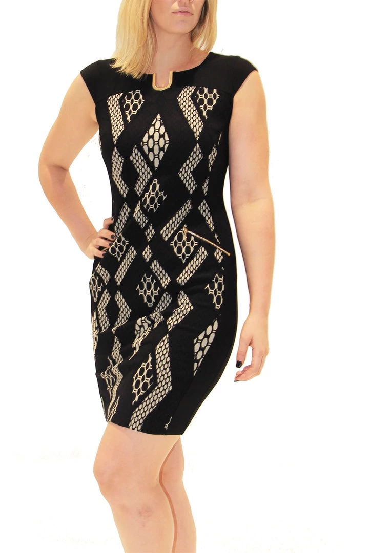 Featuring a diamond and zig zag pattern in beige + black on the front. Gold zip, + neckline embellishments.The back