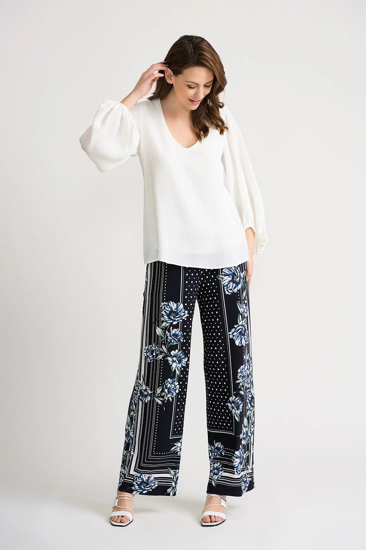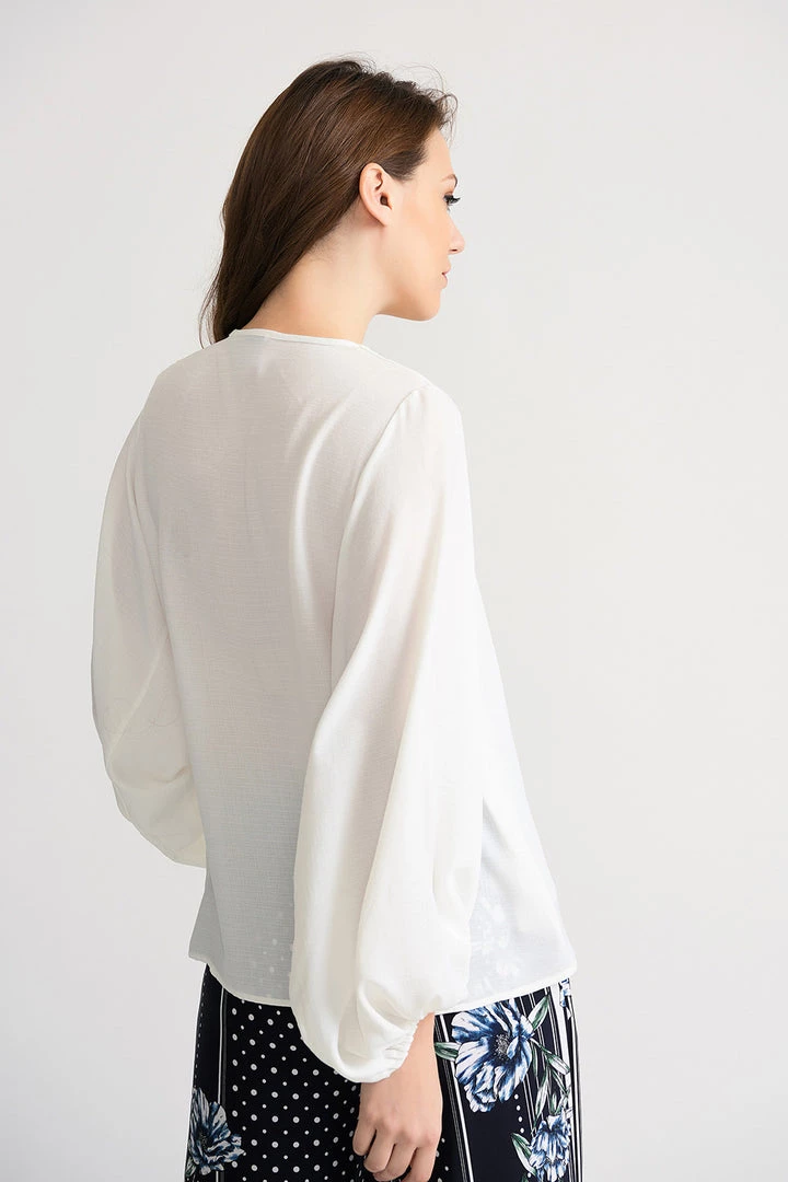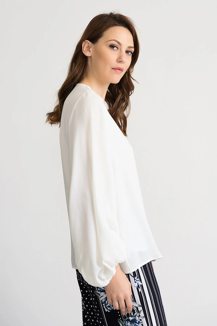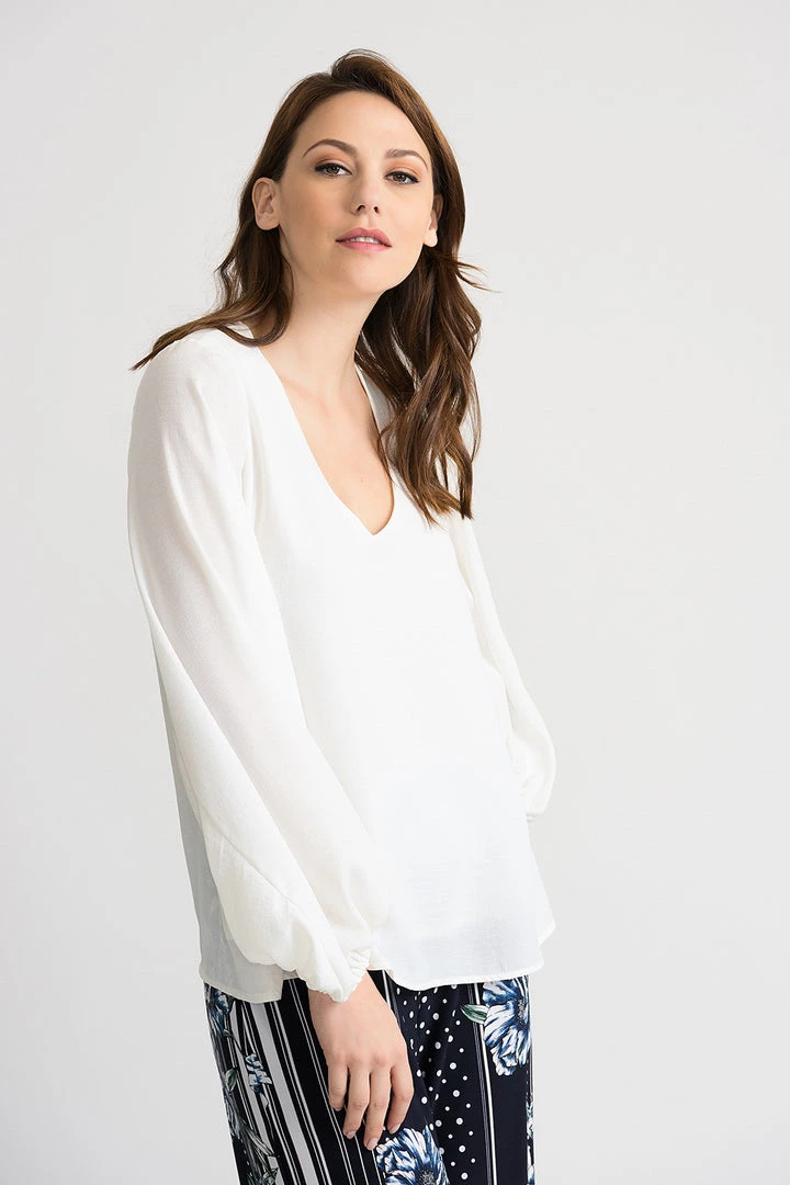 Update your classic white top with Joseph Ribkoff and their Queen Top in White. Stay true to a classic look with the soft V neckline and relaxed silhouette, but lift it to a new modern height with the sheer balloon sleeve. Perfect over a pair of wide legged Joseph Ribkoff Pants.