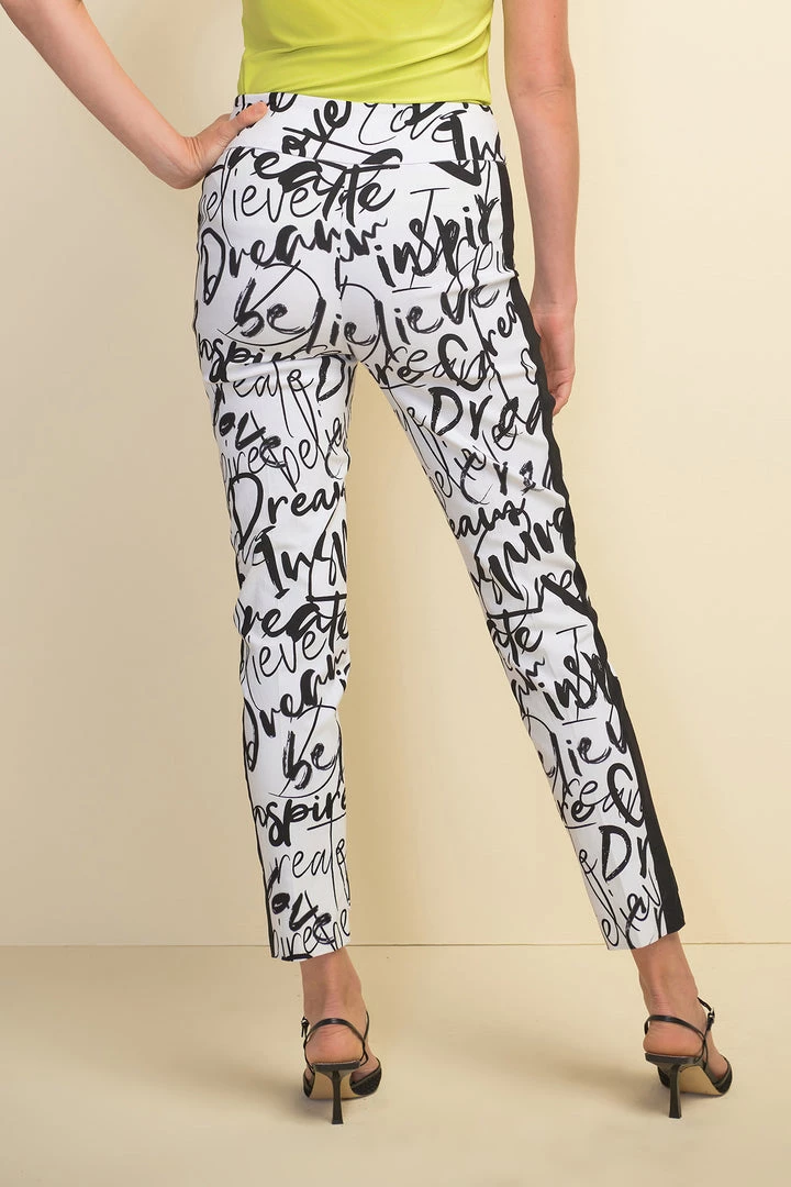 The Joseph Ribkoff Inspiration Pants are a great fit and they flatter the figure. Designed in Canada these pull on pants feature a high low hemline a military style stripe down the outside leg and a funky fashion print that says just how inspired you are on the day!. You can create a range of looks with these fun pants.Â