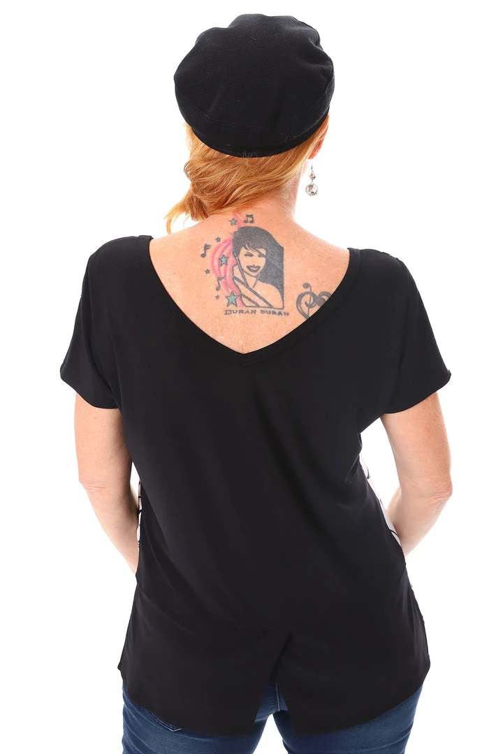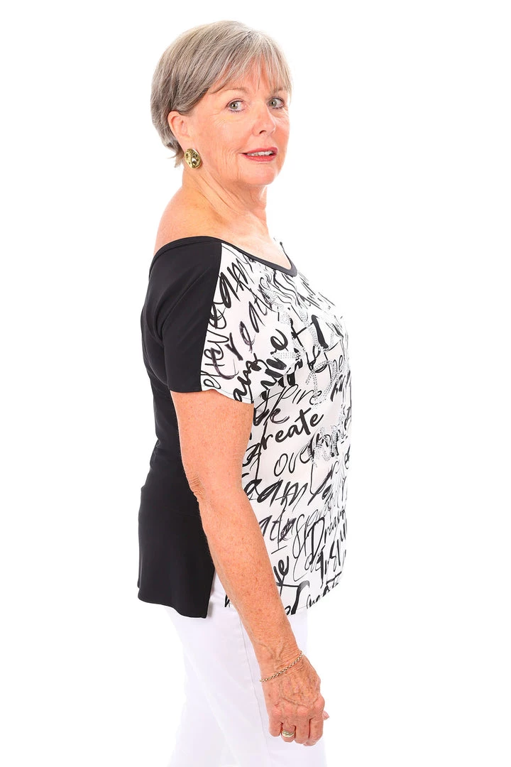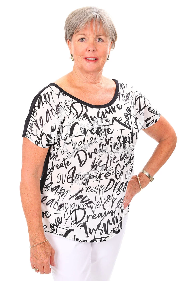 This elegant top makes a bold designer statement. Designer Joseph Ribkoff has set the standard for inspiration with this elegant top that can take you from the office to out for drinks or dinner. You’ll love to wear this top which has messages of inspiration for all to see. Featuring delicate diamante trim on printed chiffon with a plain black stretch back with rear split at the hem line this top is understated yet it is a classic piece to build your wardrobe.