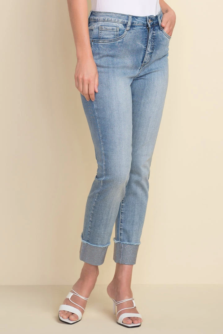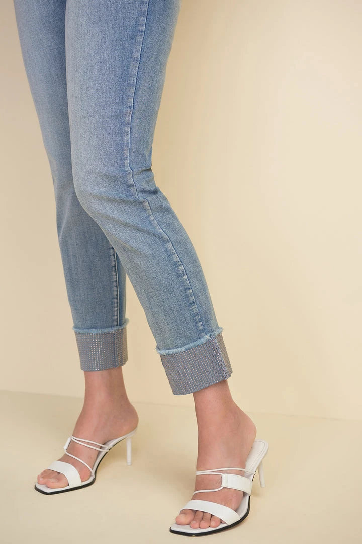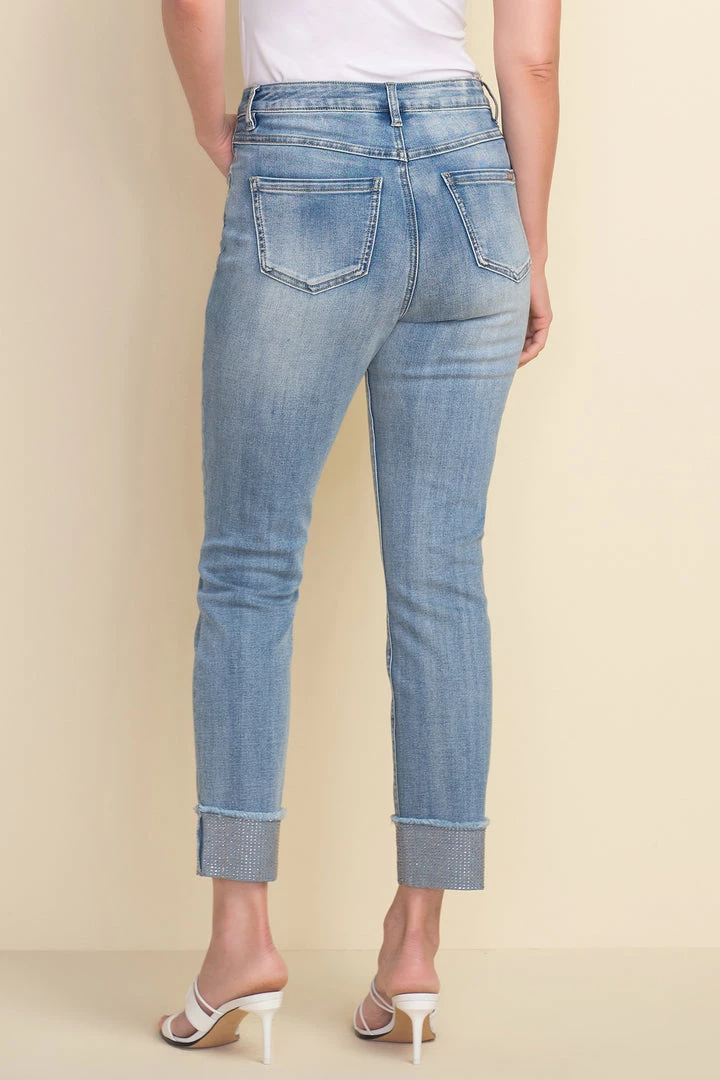 Add some sparkle to your day with these great fitting diamante jeans by designer Joseph Ribkoff simply exude style! The denim has a small amount of spandex which create a great fit. Who doesn’t love a great cropped length jean that offers designer style and this seasons must have trim – bling! These jeans look great with a contrasting white top and a pair of low heel sandals or go for a pink top that tones back to the delicate diamante trim on the jeans.Â