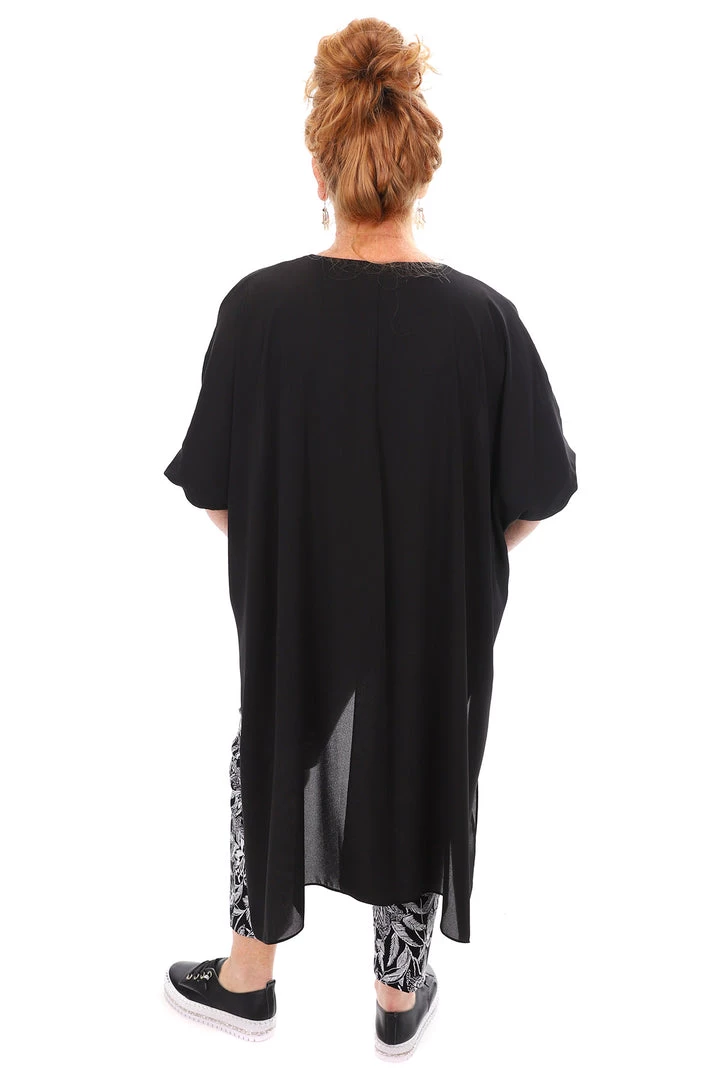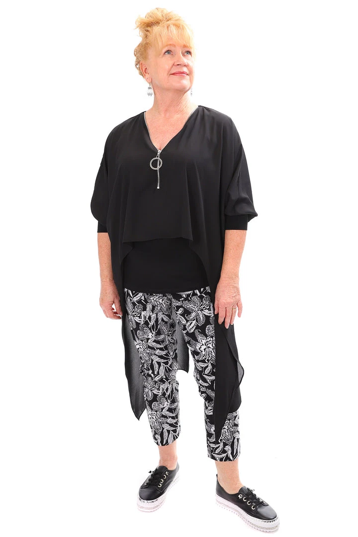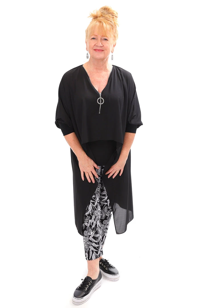 Designed in Canada by Joseph Ribkoff this Oversized Black Blouse is perfect for wearing to the office or out in the evening. The delicate chiffon fabric floats away from the body giving flattering lines to the figure. The neckline is highlighted with a zip and oversized ring pull. The high-low hemline is generous with the back featuring a long split. This blouse looks amazing and can be worn over a patterned pant for a dressed down look or teamed with a classic fitted black pant and long high boots to take you into the night.