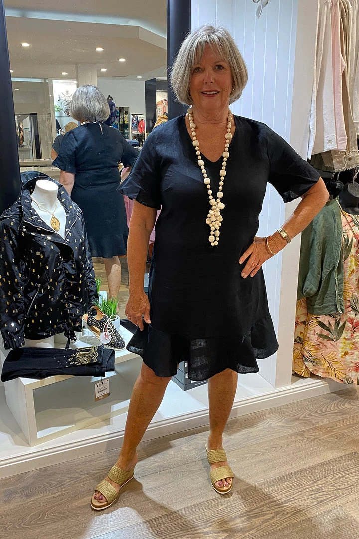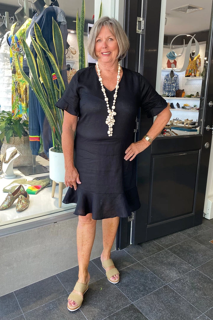 Another fabulous dress from Jump Linen. A line straight through linen dress with frill around the bottom, should sit knee length. Slip on over your head, with little shell button on the neck at the back. V neck with short sleeve and the frill feature. Dress it up with heels or down with a cute sneaker. Also available in Pink and Khaki