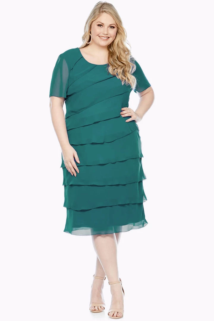 The Layla dress features asymmetrical layers of flowing chiffon in a gorgeous Holly Green, this shape and style will give this dress it’s signature look with a round neckline and sleeves to the top of your elbow, this soft flowing dress will sit just above your knee.