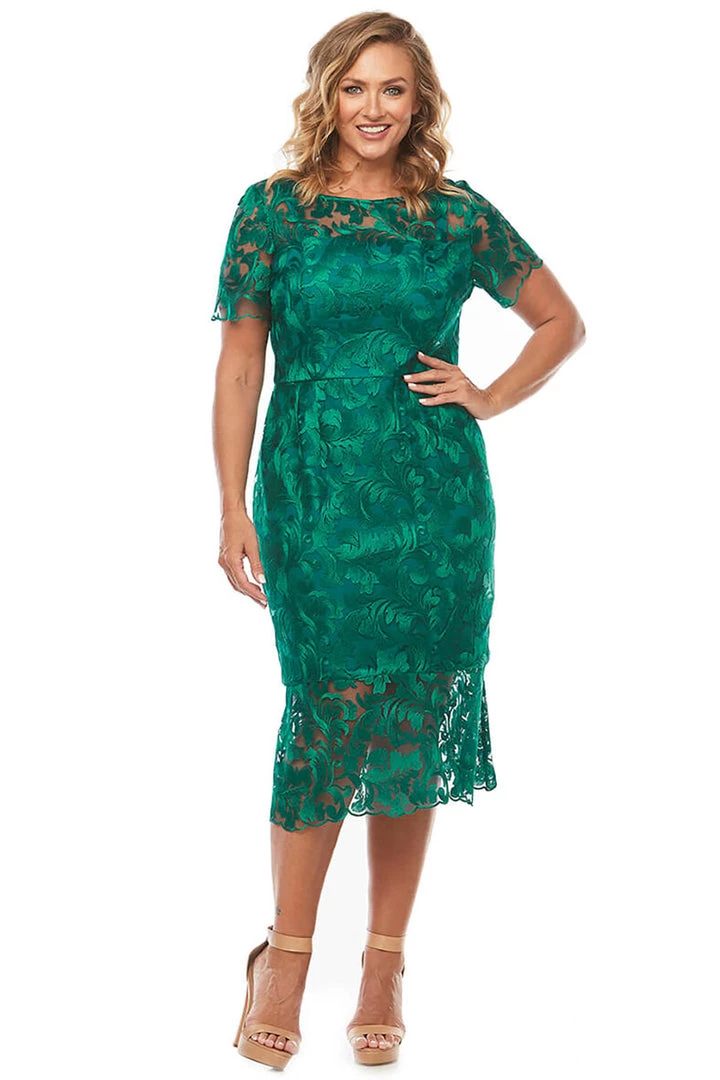 Layla Jones have designed the ultimate cocktail dress to see you through all your formal events and weddings! This emerald green dress flaunts a lined silhouette to the knee; tailored fit sheer lace to the mid shin and sheer t shirt sleeve. Finished perfectly with a sheer lace neckline and overall classiness this dress will flatter all body shapes on all occasions!Â